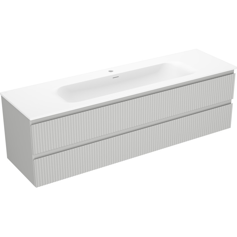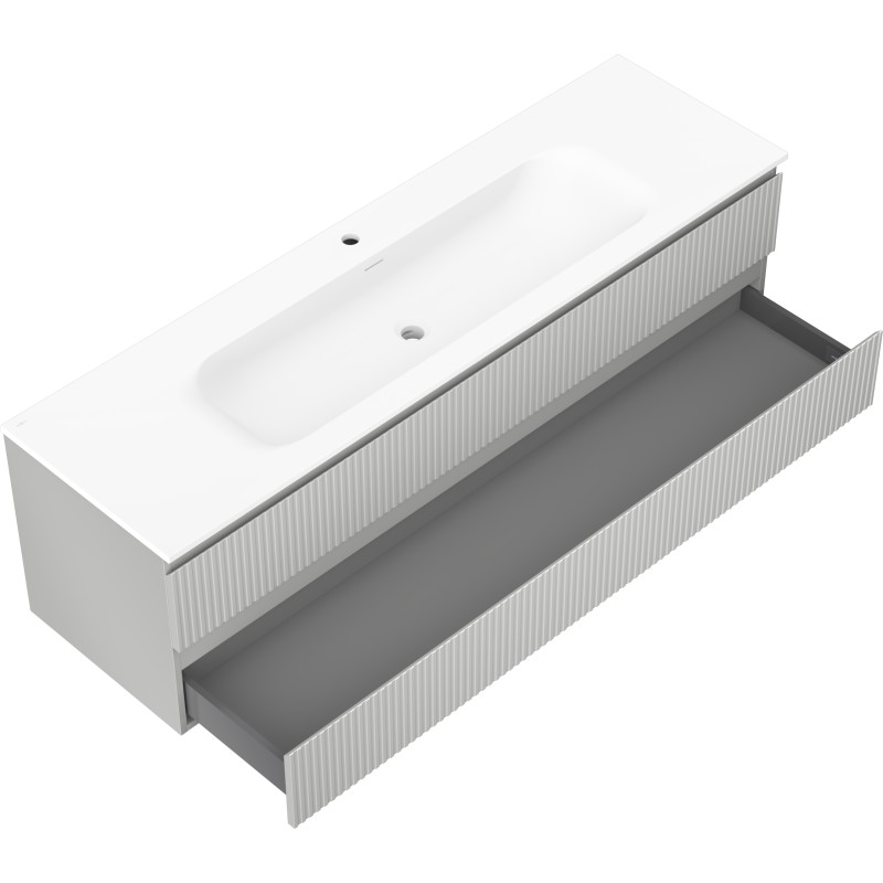 Specifikace produktu: Rozměry skříňky: Šířka: 160 cm Hloubka: 46 cm Výška: 47 cm Barva korpusu: Matně šedá Materiál korpusu: Lakovaná deska Barva čela: Matně šedá Materiál čela: Lakovaná MDF deska Struktura čela: Drážkovaná Počet zásuvek: 2 Prostorná zásuvka s funkcí tlumeného dovírání Povrch odolný vůči UV záření Rozměry umyvadla: Šířka: 161 cm Hloubka: 46,5 cm Výška: 16,5 cm Barva umyvadla: Matně bílá Materiál umyvadla: Konglomerát Otvor pro přepad: Ano Otvor pro baterii: Ano Smontovaný výrobek