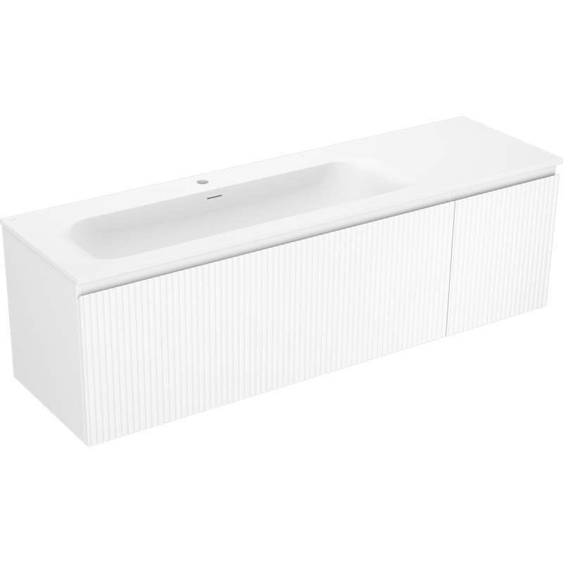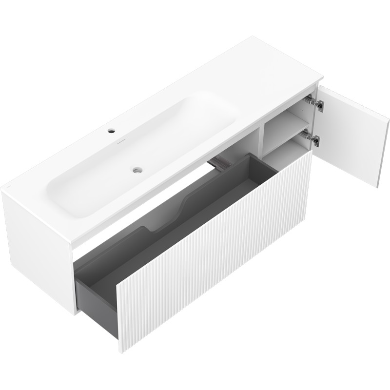 Specifikace produktu: Rozměry skříňky: Šířka: 160 cm Hloubka: 46 cm Výška: 47 cm Sada obsahuje: Zásuvková skříňka pod umyvadlo: Šířka: 120 cm Hloubka: 46 cm Výška: 47 cm Barva korpusu: Matná bílá Materiál korpusu: Lakovaná deska Barva čela: Matná bílá Materiál čela: Lakovaná MDF deska Konstrukce čela: Drážkovaná Počet zásuvek: 1 Prostorná zásuvka s funkcí tlumení dovírání Umyvadlová skříňka s dvířky: Šířka: 40 cm Výška: 47 cm Hloubka: 46 cm Barva korpusu: Matná bílá Materiál korpusu: Lakovaná deska Barva čela: Matná bílá Materiál čela: Lakovaná MDF deska Konstrukce čela: Drážkovaná Počet dvířek: 1 1 police Panty s funkcí tlumení dovírání Univerzální montáž dvířek (levé/pravé) Povrch odolný vůči UV záření Umyvadlo: Šířka: 161 cm Hloubka: 46,5 cm Výška: 16,5 cm Barva umyvadla: Matná bílá Materiál umyvadla: Konglomerát Otvor pro přepad: Ano Otvor pro baterii: Ano Výrobek smontovaný