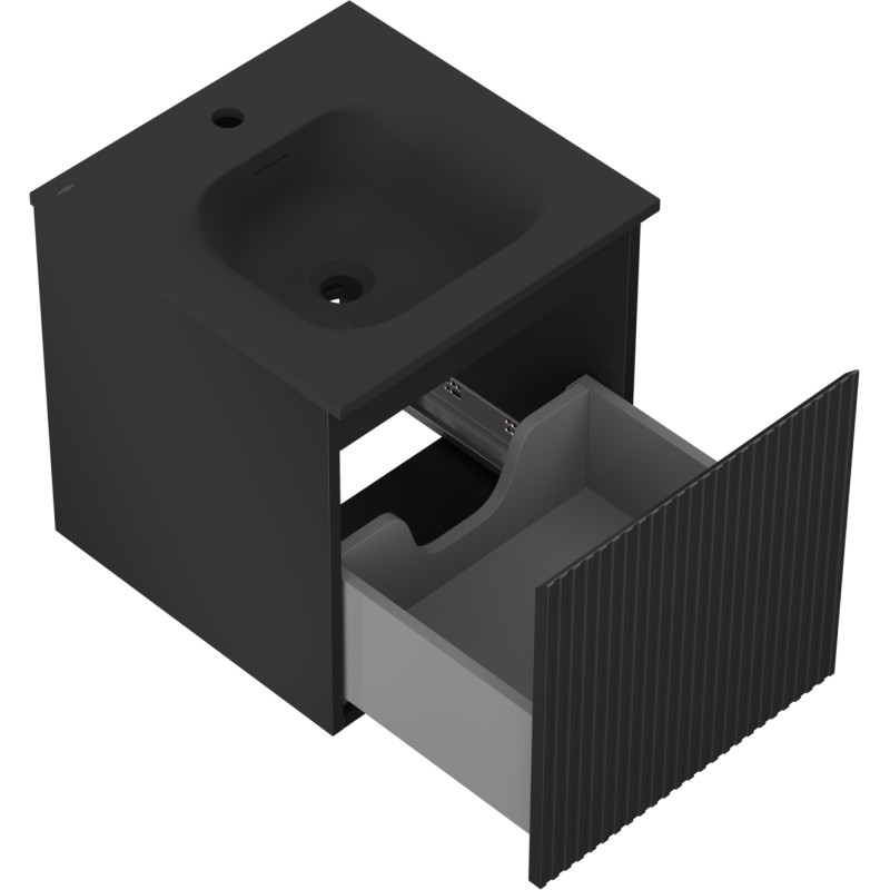 Specifikace produktu: Rozměry skříňky: Šířka: 45 cm Hloubka: 46 cm Výška: 47 cm Barva korpusu: Matná černá Materiál korpusu: Lakovaná deska Barva čela: Matná černá Materiál čela: Lakovaná MDF deska Struktura čela: Drážkovaná Počet zásuvek: 1 Prostorná zásuvka s funkcí tichého dovírání Povrch odolný vůči UV záření Rozměry umyvadla: Šířka: 46 cm Hloubka: 46,5 cm Výška: 16,5 cm Barva umyvadla: Matná černá Materiál umyvadla: Konglomerát Otvor pro přepad: Ano Otvor pro baterii: Ano Smontovaný výrobek