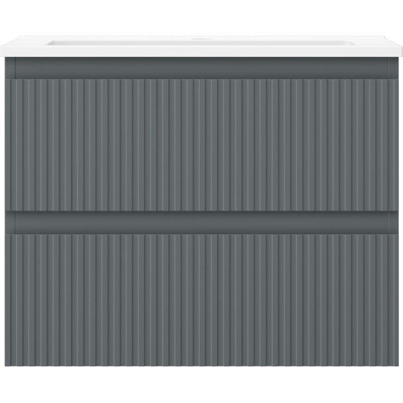 Specifikace produktu: Rozměry skříňky: Šířka: 60 cm Hloubka: 46 cm Výška: 47 cm Barva korpusu: Matný grafit Materiál korpusu: Lakovaná deska Barva čela: Matný grafit Materiál čela: Lakovaná MDF deska Struktura čela: Drážkovaná Počet zásuvek: 2 Prostorná zásuvka s funkcí tlumeného dovírání Povrch odolný vůči UV záření Rozměry umyvadla: Šířka: 61 cm Hloubka: 46,5 cm Výška: 16,5 cm Barva umyvadla: Matná bílá Materiál umyvadla: Konglomerát Otvor pro přepad: Ano Otvor pro baterii: Ano Smontovaný výrobek