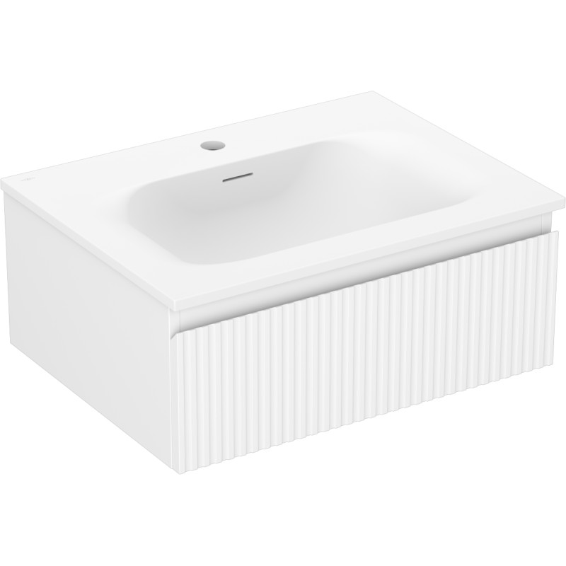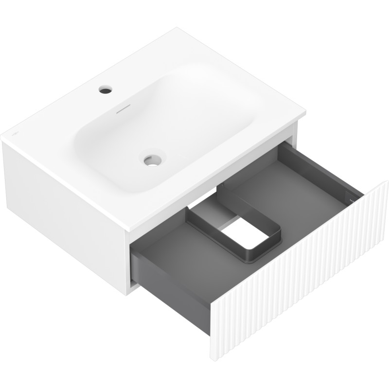 Specifikace produktu: Rozměry skříňky: Šířka: 60 cm Hloubka: 46 cm Výška: 23,5 cm Barva korpusu: Matná bílá Materiál korpusu: Lakovaná deska Barva čela: Matná bílá Materiál čela: Lakovaná MDF deska Struktura čela: Drážkovaná Počet zásuvek: 1 Prostorná zásuvka s funkcí tlumeného dovírání Povrch odolný vůči UV záření Rozměry umyvadla: Šířka: 61 cm Hloubka: 46,5 cm Výška: 16,5 cm Barva umyvadla: Matná bílá Materiál umyvadla: Konglomerát Otvor pro přepad: Ano Otvor pro baterii: Ano Smontovaný výrobek