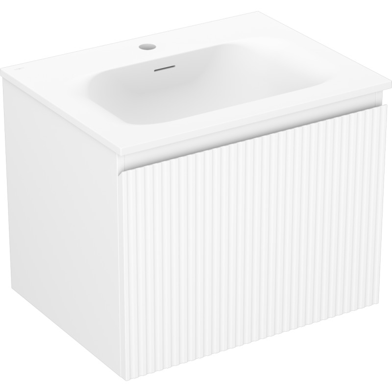 Specifikace produktu: Rozměry skříňky: Šířka: 60 cm Hloubka: 46 cm Výška: 47 cm Barva korpusu: Matná bílá Materiál korpusu: Lakovaná deska Barva čela: Matná bílá Materiál čela: Lakovaná MDF deska Struktura čela: Drážkovaná Počet zásuvek: 1 Prostorná zásuvka s funkcí tlumeného dovírání Povrch odolný vůči UV záření Rozměry umyvadla: Šířka: 61 cm Hloubka: 46,5 cm Výška: 16,5 cm Barva umyvadla: Matná bílá Materiál umyvadla: Konglomerát Otvor pro přepad: Ano Otvor pro baterii: Ano Smontovaný výrobek