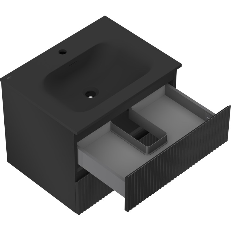 Specifikace produktu: Rozměry skříňky: Šířka: 60 cm Hloubka: 46 cm Výška: 47 cm Barva korpusu: Matná černá Materiál korpusu: Lakovaná deska Barva čela: Matná černá Materiál čela: Lakovaná MDF deska Struktura čela: Drážkovaná Počet zásuvek: 2 Prostorná zásuvka s funkcí tichého dovírání Povrch odolný vůči UV záření Rozměry umyvadla: Šířka: 61 cm Hloubka: 46,5 cm Výška: 16,5 cm Barva umyvadla: Matná černá Materiál umyvadla: Konglomerát Otvor pro přepad: Ano Otvor pro baterii: Ano Smontovaný výrobek