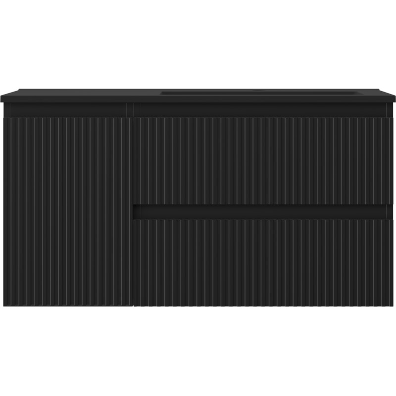 Specifikace produktu: Rozměry skříňky: Šířka: 90 cm Hloubka: 46 cm Výška: 47 cm Sada obsahuje: Zásuvková skříňka pod umyvadlo: Šířka: 60 cm Hloubka: 46 cm Výška: 47 cm Barva korpusu: Matná černá Materiál korpusu: Lakovaná deska Barva čela: Matná černá Materiál čela: Lakovaná MDF deska Konstrukce čela: Drážkovaná Počet zásuvek: 2 Prostorná zásuvka s funkcí tlumeného dovírání Umyvadlová skříňka s dvířky: Šířka: 30 cm Výška: 47 cm Hloubka: 46 cm Barva korpusu: Matná černá Materiál korpusu: Lakovaná deska Barva čela: Matná černá Materiál čela: Lakovaná MDF deska Konstrukce čela: Drážkovaná Počet dvířek: 1 1 police Panty s funkcí tlumeného dovírání Univerzální montáž dvířek (levé/pravé) UV odolný povrch Umyvadlo: Šířka: 91 cm Hloubka: 46,5 cm Výška: 16,5 cm Barva umyvadla: Matná černá Materiál umyvadla: Konglomerát Otvor pro přepad: Ano Otvor pro baterii: Ano Smontovaný výrobek