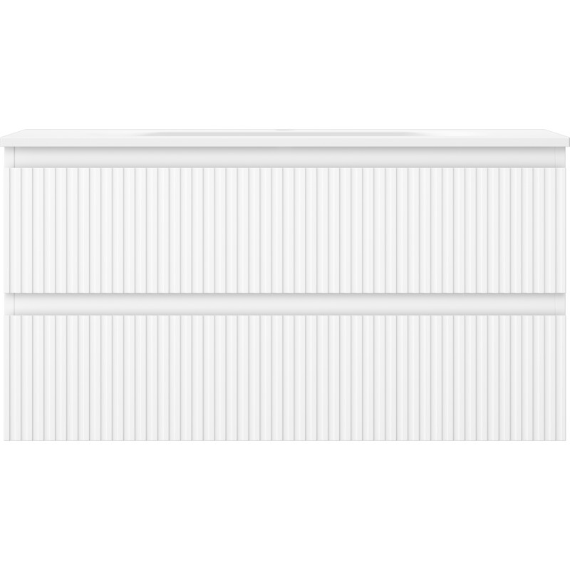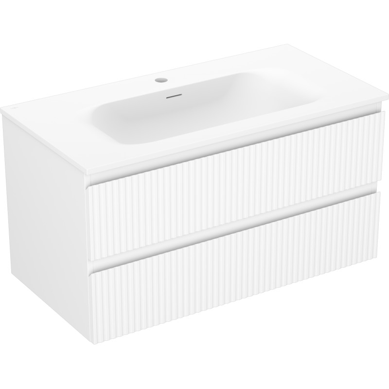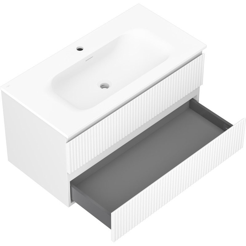 Specifikace produktu: Rozměry skříňky: Šířka: 90 cm Hloubka: 46 cm Výška: 47 cm Barva korpusu: Matná bílá Materiál korpusu: Lakovaná deska Barva čela: Matná bílá Materiál čela: Lakovaná MDF deska Struktura čela: Drážkovaná Počet zásuvek: 2 Prostorná zásuvka s funkcí tlumeného dovírání Povrch odolný vůči UV záření Rozměry umyvadla: Šířka: 91 cm Hloubka: 46,5 cm Výška: 16,5 cm Barva umyvadla: Matná bílá Materiál umyvadla: Konglomerát Otvor pro přepad: Ano Otvor pro baterii: Ano Smontovaný výrobek