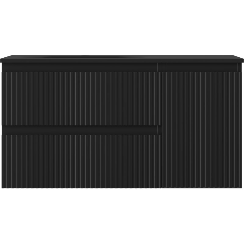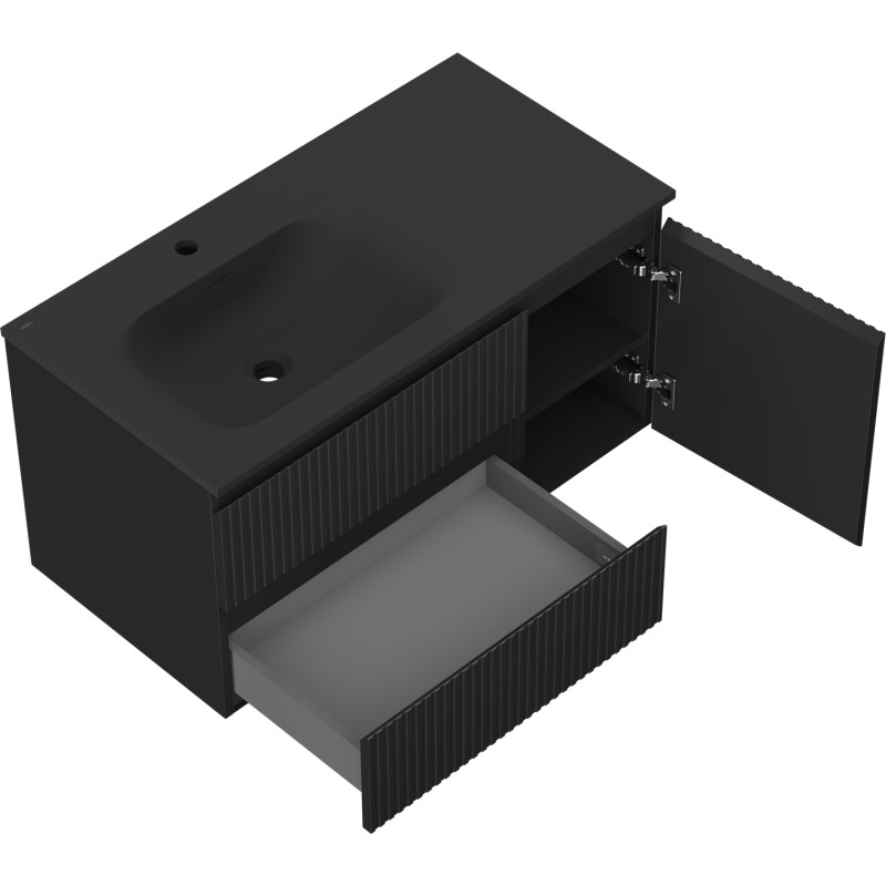 Specifikace produktu: Rozměry skříňky: Šířka: 90 cm Hloubka: 46 cm Výška: 47 cm Sada obsahuje: Zásuvková skříňka pod umyvadlo: Šířka: 60 cm Hloubka: 46 cm Výška: 47 cm Barva korpusu: Matná černá Materiál korpusu: Lakovaná deska Barva čela: Matná černá Materiál čela: Lakovaná MDF deska Konstrukce čela: Drážkovaná Počet zásuvek: 2 Prostorná zásuvka s funkcí tlumeného dovírání Umyvadlová skříňka s dvířky: Šířka: 30 cm Výška: 47 cm Hloubka: 46 cm Barva korpusu: Matná černá Materiál korpusu: Lakovaná deska Barva čela: Matná černá Materiál čela: Lakovaná MDF deska Konstrukce čela: Drážkovaná Počet dvířek: 1 1 police Panty s funkcí tlumeného dovírání Univerzální montáž dvířek (levé/pravé) UV odolný povrch Umyvadlo: Šířka: 91 cm Hloubka: 46,5 cm Výška: 16,5 cm Barva umyvadla: Matná černá Materiál umyvadla: Konglomerát Otvor pro přepad: Ano Otvor pro baterii: Ano Smontovaný výrobek