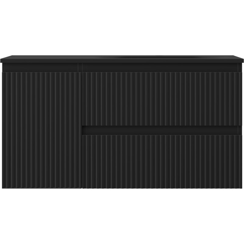 Specifikace produktu: Rozměry skříňky: Šířka: 90 cm Hloubka: 46 cm Výška: 47 cm Sada obsahuje: Zásuvková skříňka pod umyvadlo: Šířka: 60 cm Hloubka: 46 cm Výška: 47 cm Barva korpusu: Matná černá Materiál korpusu: Lakovaná deska Barva čela: Matná černá Materiál čela: Lakovaná MDF deska Konstrukce čela: Drážkovaná Počet zásuvek: 2 Prostorná zásuvka s funkcí tlumeného dovírání Umyvadlová skříňka s dvířky: Šířka: 30 cm Výška: 47 cm Hloubka: 46 cm Barva korpusu: Matná černá Materiál korpusu: Lakovaná deska Barva čela: Matná černá Materiál čela: Lakovaná MDF deska Konstrukce čela: Drážkovaná Počet dvířek: 1 1 police Panty s funkcí tlumeného dovírání Univerzální montáž dvířek (levé/pravé) UV odolný povrch Umyvadlo: Šířka: 91 cm Hloubka: 46,5 cm Výška: 16,5 cm Barva umyvadla: Matná černá Materiál umyvadla: Konglomerát Otvor pro přepad: Ano Otvor pro baterii: Ano Smontovaný výrobek