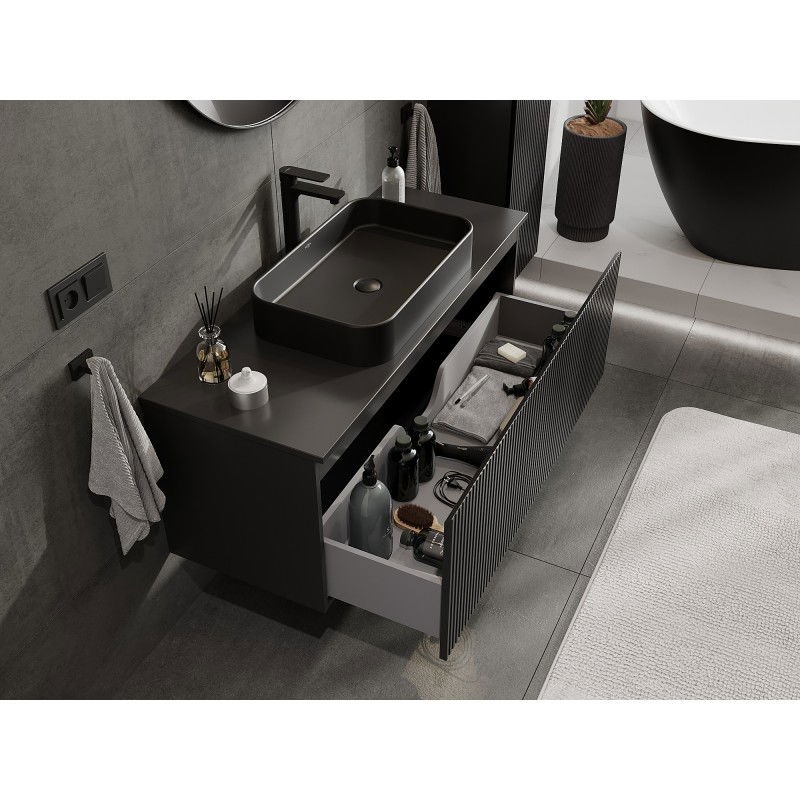 Specifikace produktu: Rozměry skříňky: Šířka: 120 cm Výška: 47 cm Hloubka: 46 cm Barva korpusu: Matná černá Materiál korpusu: Lakovaná deska Barva čela: Matná černá Materiál čela: Lakovaná MDF deska Struktura čela: Drážkovaná Počet zásuvek: 1 Prostorná zásuvka s funkcí tlumeného dovírání Plný výsuv pro snadný přístup k obsahu zásuvky Povrch odolný vůči UV záření Rozměry pracovní desky: Šířka: 120,6 cm Hloubka: 46,5 cm Tloušťka: 1,8 cm Barva pracovní desky: Matná černá Materiál pracovní desky: Lakovaná MDF deska Povrch odolný vůči UV záření Ideální jako podstavec pro umyvadla na desku Sestavený produkt