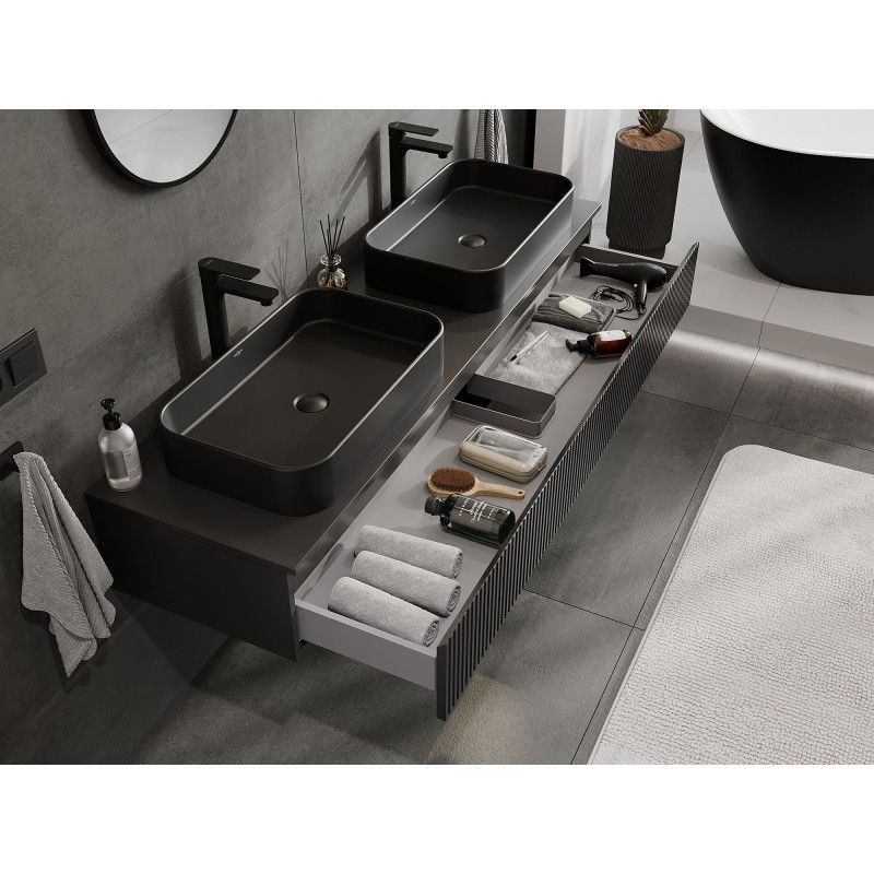 Specifikace produktu: Rozměry skříňky: Šířka: 160 cm Výška: 23,5 cm Hloubka: 46 cm Barva korpusu: Matná černá Materiál korpusu: Lakovaná deska Barva čela: Matná černá Materiál čela: Lakovaná MDF deska Struktura čela: Drážkovaná Počet zásuvek: 1 Prostorná zásuvka s funkcí tlumeného dovírání Plný výsuv pro snadný přístup k obsahu zásuvky Povrch odolný vůči UV záření Rozměry pracovní desky: Šířka: 160,6 cm Hloubka: 46,5 cm Tloušťka: 1,8 cm Barva pracovní desky: Matná černá Materiál pracovní desky: Lakovaná MDF deska Povrch odolný vůči UV záření Ideální jako podstavec pro umyvadla na desku Sestavený produkt