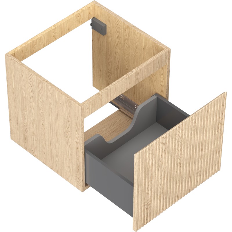 Specifikace produktu: Šířka: 50 cm Výška: 47 cm Hloubka: 46 cm Barva korpusu: Dub Materiál korpusu: Deska + PVC fólie Barva čela: Dub Materiál čela: MDF deska + PVC fólie Struktura čela: Drážkovaná Počet zásuvek: 1 Prostorná zásuvka s funkcí tlumeného dovírání Plný výsuv pro snadný přístup k obsahu zásuvky Povrch odolný vůči UV záření Kombinovatelný s pracovní deskou nebo umyvadlem Otis, Vela Smontovaný produkt