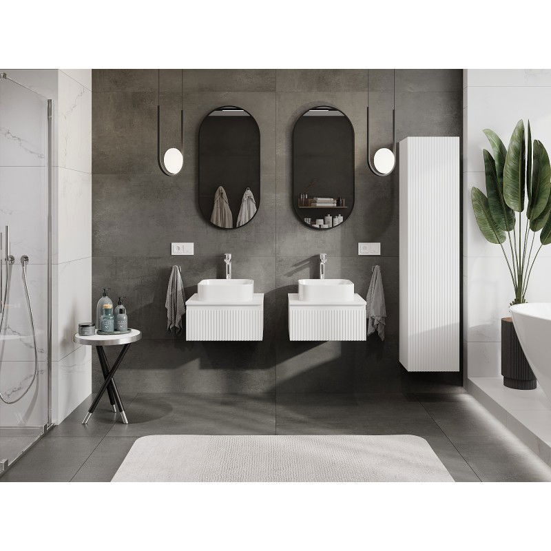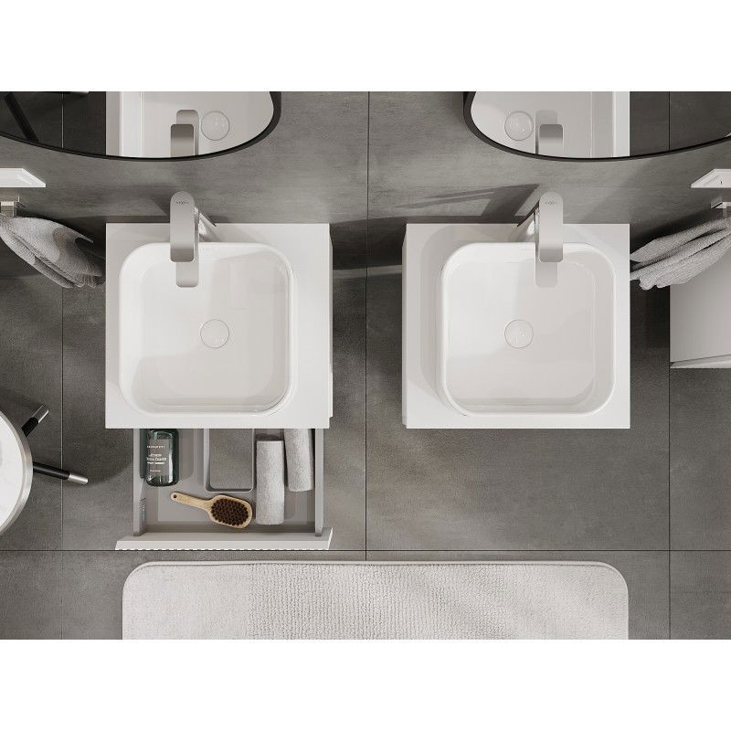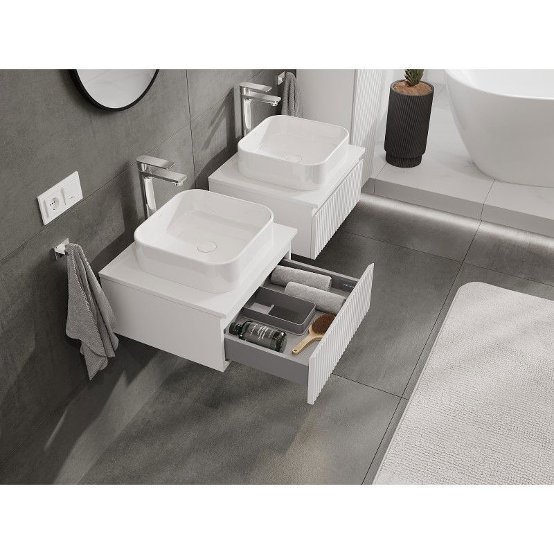 Specifikace produktu: Rozměry skříňky: Šířka: 50 cm Výška: 23,5 cm Hloubka: 46 cm Barva korpusu: Matná bílá Materiál korpusu: Lakovaná deska Barva čela: Matná bílá Materiál čela: Lakovaná MDF deska Struktura čela: Drážkovaná Počet zásuvek: 1 Prostorná zásuvka s funkcí tlumeného dovírání Plný výsuv pro snadný přístup k obsahu zásuvky Povrch odolný vůči UV záření Rozměry pracovní desky: Šířka: 50,6 cm Hloubka: 46,5 cm Tloušťka: 1,8 cm Barva pracovní desky: Matná bílá Materiál pracovní desky: Lakovaná MDF deska Povrch odolný vůči UV záření Ideální jako podstavec pro umyvadla na desku Sestavený produkt
