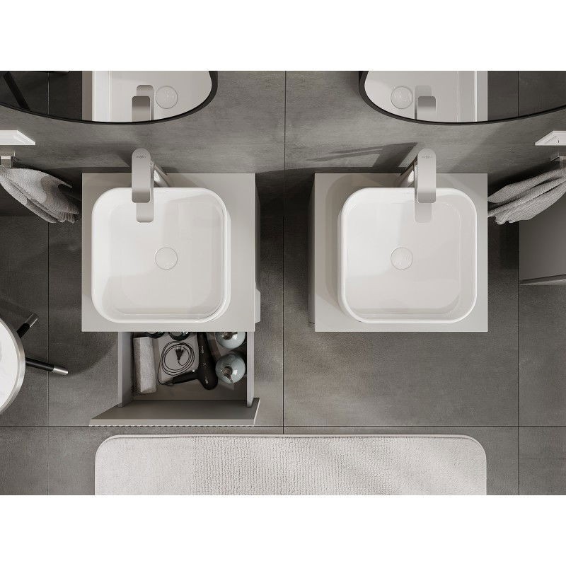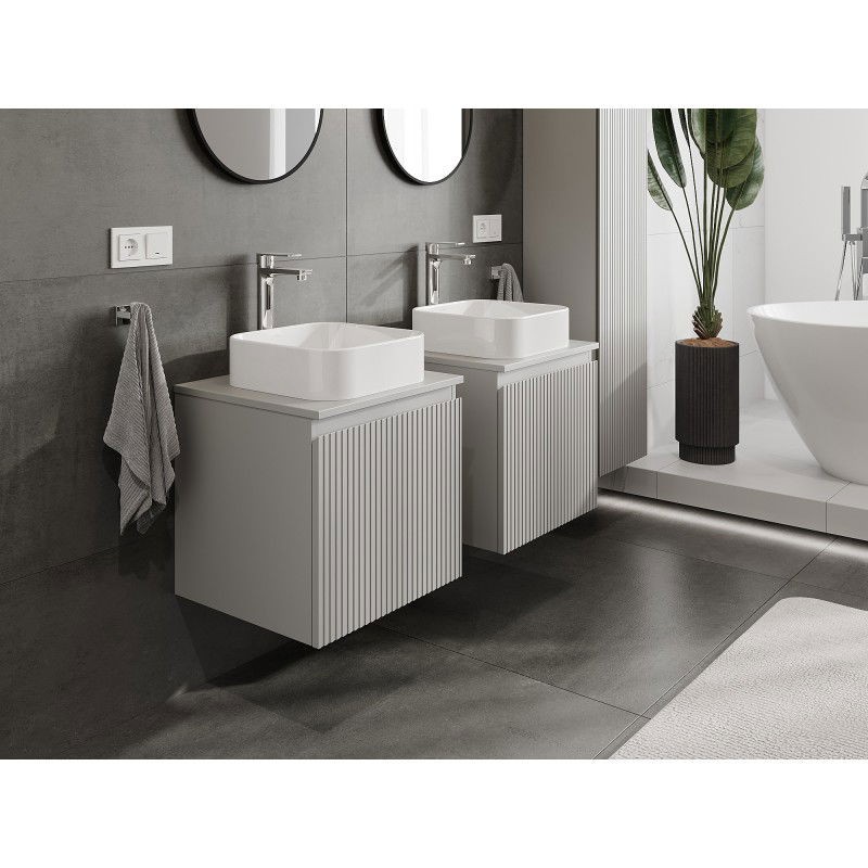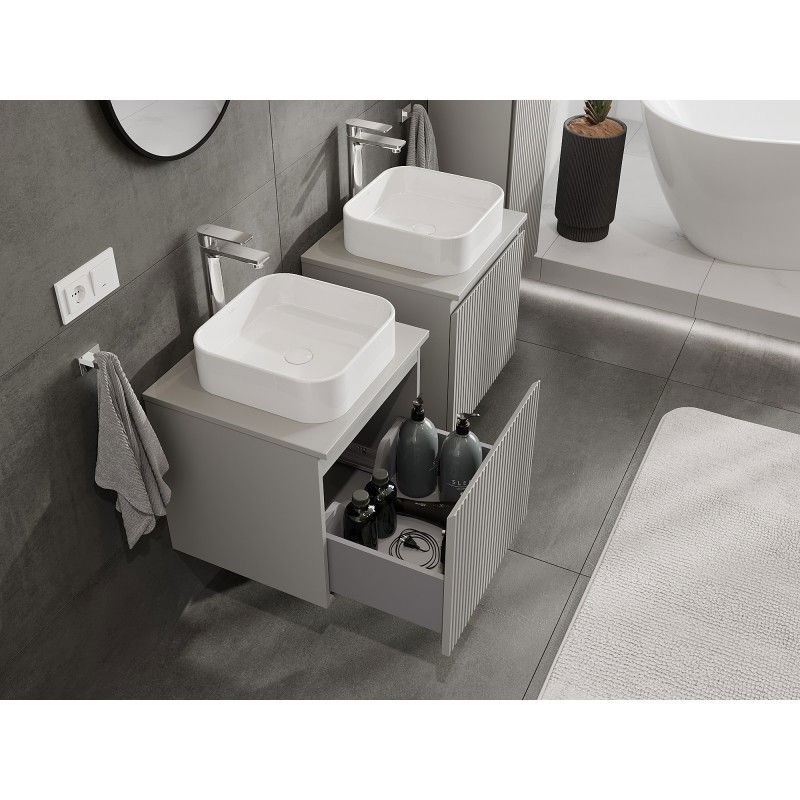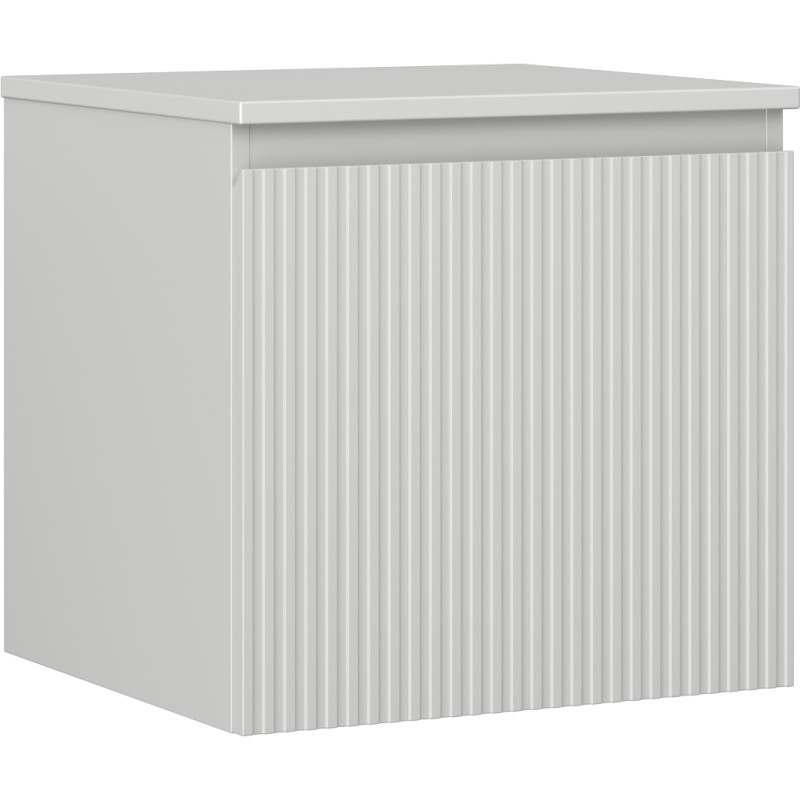 Specifikace produktu: Rozměry skříňky: Šířka: 50 cm Výška: 47 cm Hloubka: 46 cm Barva korpusu: Matně šedá Materiál korpusu: Lakovaná deska Barva čela: Matně šedá Materiál čela: Lakovaná MDF deska Struktura čela: Drážkovaná Počet zásuvek: 1 Prostorná zásuvka s funkcí tlumeného dovírání Plný výsuv pro snadný přístup k obsahu zásuvky Povrch odolný vůči UV záření Rozměry pracovní desky: Šířka: 50,6 cm Hloubka: 46,5 cm Tloušťka: 1,8 cm Barva pracovní desky: Matně šedá Materiál pracovní desky: Lakovaná MDF deska Povrch odolný vůči UV záření Ideální jako podstavec pro umyvadla na desku Sestavený produkt