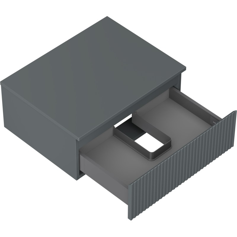 Specifikace produktu: Rozměry skříňky: Šířka: 60 cm Výška: 23,5 cm Hloubka: 46 cm Barva korpusu: Matný grafit Materiál korpusu: Lakovaná deska Barva čela: Matný grafit Materiál čela: Lakovaná MDF deska Struktura čela: Drážkovaná Počet zásuvek: 1 Prostorná zásuvka s funkcí tlumeného dovírání Plný výsuv pro snadný přístup k obsahu zásuvky Povrch odolný vůči UV záření Rozměry pracovní desky: Šířka: 60,6 cm Hloubka: 46,5 cm Tloušťka: 1,8 cm Barva pracovní desky: Matný grafit Materiál pracovní desky: Lakovaná MDF deska Povrch odolný vůči UV záření Ideální jako podstavec pro umyvadla na desku Sestavený produkt
