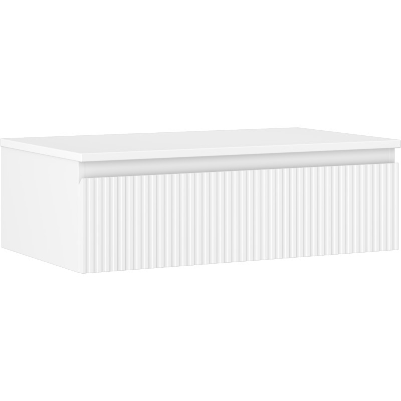 Specifikace produktu: Rozměry skříňky: Šířka: 80 cm Výška: 23,5 cm Hloubka: 46 cm Barva korpusu: Matná bílá Materiál korpusu: Lakovaná deska Barva čela: Matná bílá Materiál čela: Lakovaná MDF deska Struktura čela: Drážkovaná Počet zásuvek: 1 Prostorná zásuvka s funkcí tlumeného dovírání Plný výsuv pro snadný přístup k obsahu zásuvky Povrch odolný vůči UV záření Rozměry pracovní desky: Šířka: 80,6 cm Hloubka: 46,5 cm Tloušťka: 1,8 cm Barva pracovní desky: Matná bílá Materiál pracovní desky: Lakovaná MDF deska Povrch odolný vůči UV záření Ideální jako podstavec pro umyvadla na desku Sestavený produkt