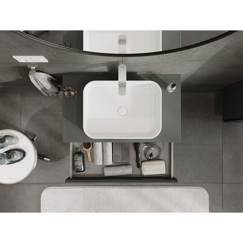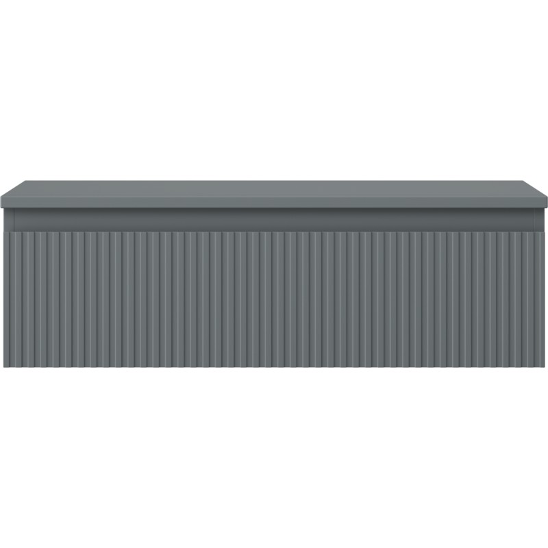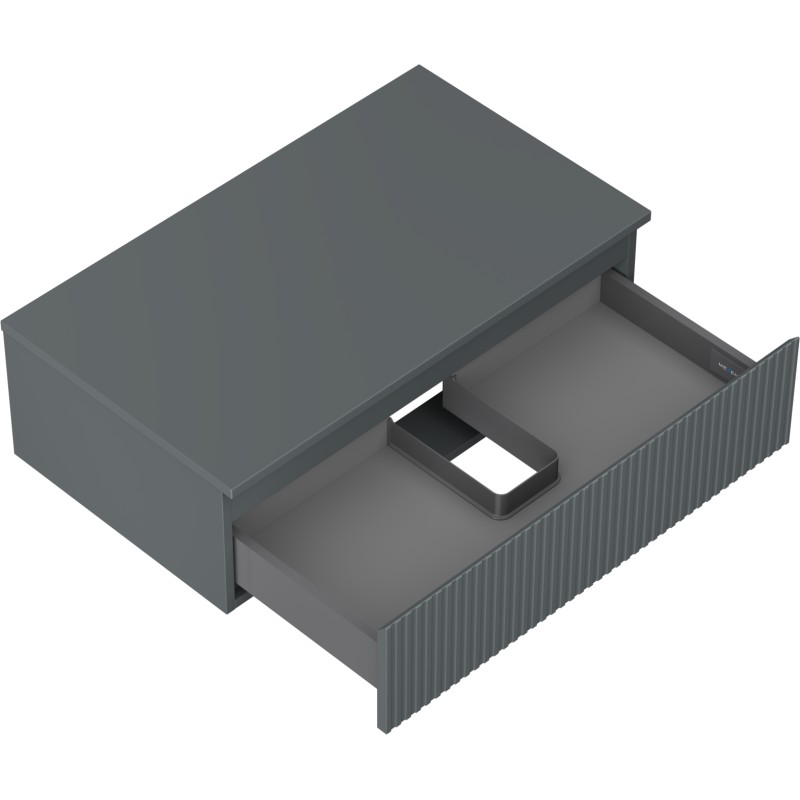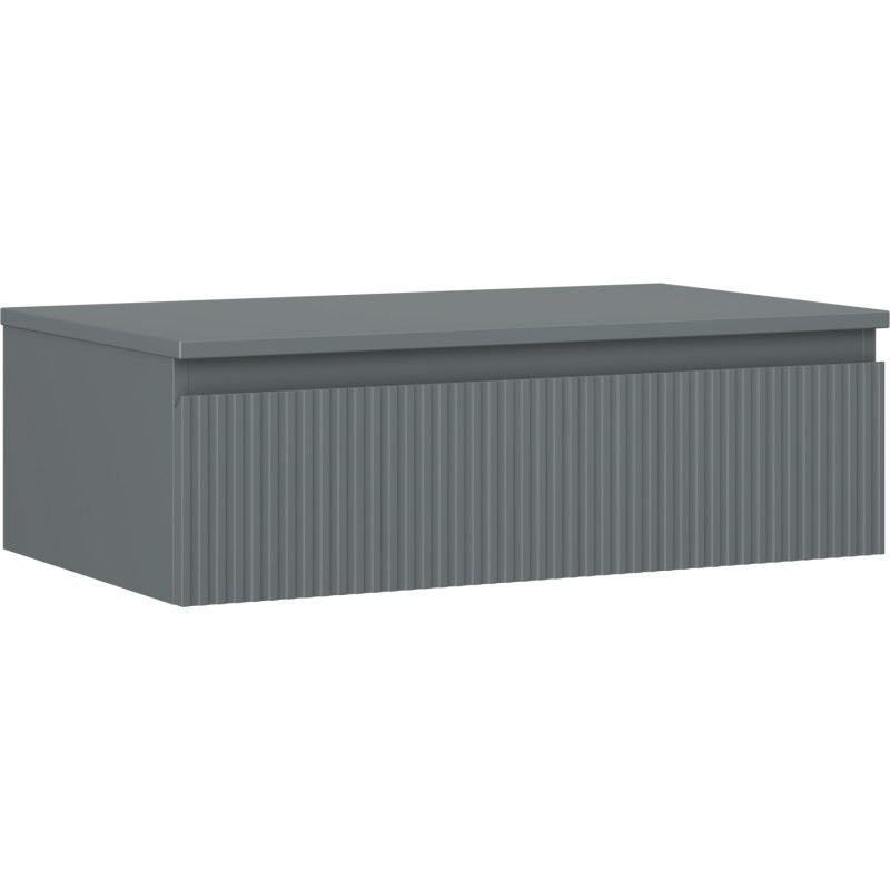 Specifikace produktu: Rozměry skříňky: Šířka: 80 cm Výška: 23,5 cm Hloubka: 46 cm Barva korpusu: Matný grafit Materiál korpusu: Lakovaná deska Barva čela: Matný grafit Materiál čela: Lakovaná MDF deska Struktura čela: Drážkovaná Počet zásuvek: 1 Prostorná zásuvka s funkcí tlumeného dovírání Plný výsuv pro snadný přístup k obsahu zásuvky Povrch odolný vůči UV záření Rozměry pracovní desky: Šířka: 80,6 cm Hloubka: 46,5 cm Tloušťka: 1,8 cm Barva pracovní desky: Matný grafit Materiál pracovní desky: Lakovaná MDF deska Povrch odolný vůči UV záření Ideální jako podstavec pro umyvadla na desku Sestavený produkt