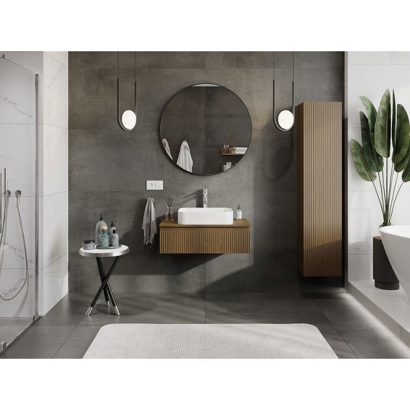 Specifikace produktu: Rozměry skříňky: Šířka: 80 cm Výška: 23,5 cm Hloubka: 46 cm Barva korpusu: Ořech Materiál korpusu: Deska + PVC fólie Barva čela: Ořech Materiál čela: MDF deska + PVC fólie Struktura čela: Drážkovaná Počet zásuvek: 1 Prostorná zásuvka s funkcí tlumeného dovírání Plný výsuv pro snadný přístup k obsahu zásuvky Povrch odolný vůči UV záření Rozměry pracovní desky: Šířka: 80,6 cm Hloubka: 46,5 cm Tloušťka: 1,8 cm Barva pracovní desky: Ořech Materiál pracovní desky: MDF deska + PVC fólie Povrch odolný vůči UV záření Ideální jako podstavec pro umyvadla na desku Sestavený produkt