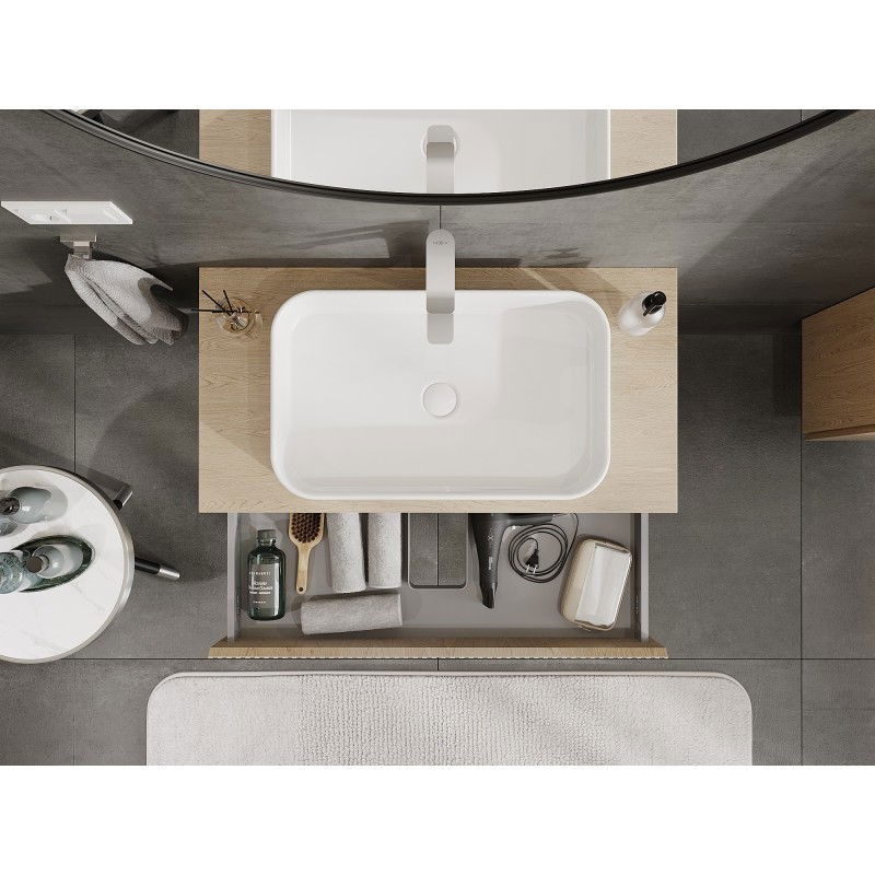 Specifikace produktu: Rozměry skříňky: Šířka: 90 cm Výška: 23,5 cm Hloubka: 46 cm Barva korpusu: Dub Materiál korpusu: Deska + PVC fólie Barva čela: Dub Materiál čela: MDF deska + PVC fólie Struktura čela: Drážkovaná Počet zásuvek: 1 Prostorná zásuvka s funkcí tlumeného dovírání Plný výsuv pro snadný přístup k obsahu zásuvky Povrch odolný vůči UV záření Rozměry pracovní desky: Šířka: 90,6 cm Hloubka: 46,5 cm Tloušťka: 1,8 cm Barva pracovní desky: Dub Materiál pracovní desky: MDF deska + PVC fólie Povrch odolný vůči UV záření Ideální jako podstavec pro umyvadla na desku Sestavený produkt