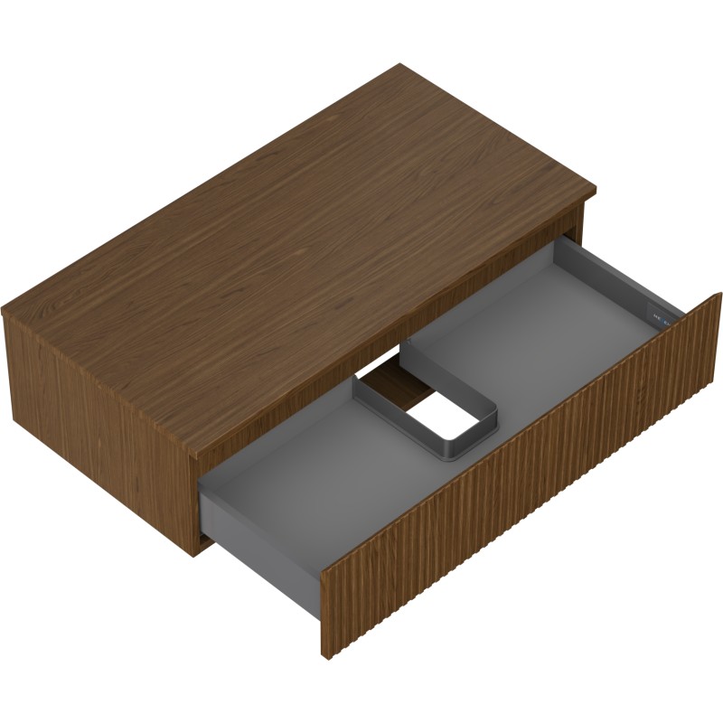 Specifikace produktu: Rozměry skříňky: Šířka: 90 cm Výška: 23,5 cm Hloubka: 46 cm Barva korpusu: Ořech Materiál korpusu: Deska + PVC fólie Barva čela: Ořech Materiál čela: MDF deska + PVC fólie Struktura čela: Drážkovaná Počet zásuvek: 1 Prostorná zásuvka s funkcí tlumeného dovírání Plný výsuv pro snadný přístup k obsahu zásuvky Povrch odolný vůči UV záření Rozměry pracovní desky: Šířka: 90,6 cm Hloubka: 46,5 cm Tloušťka: 1,8 cm Barva pracovní desky: Ořech Materiál pracovní desky: MDF deska + PVC fólie Povrch odolný vůči UV záření Ideální jako podstavec pro umyvadla na desku Sestavený produkt