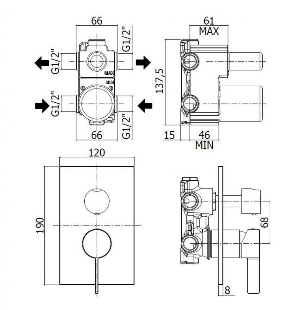 Sprchová páková baterie s otočným přepínačem včetně podomítkového tělesa pro 2 vývody