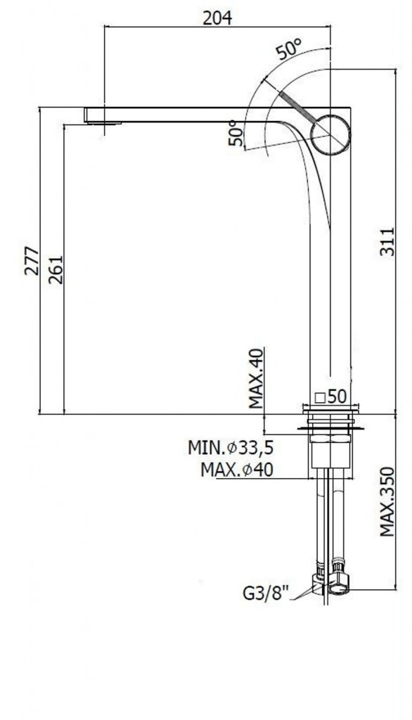 - délka výtoku 204 mm, komfortní zóna 261 mm