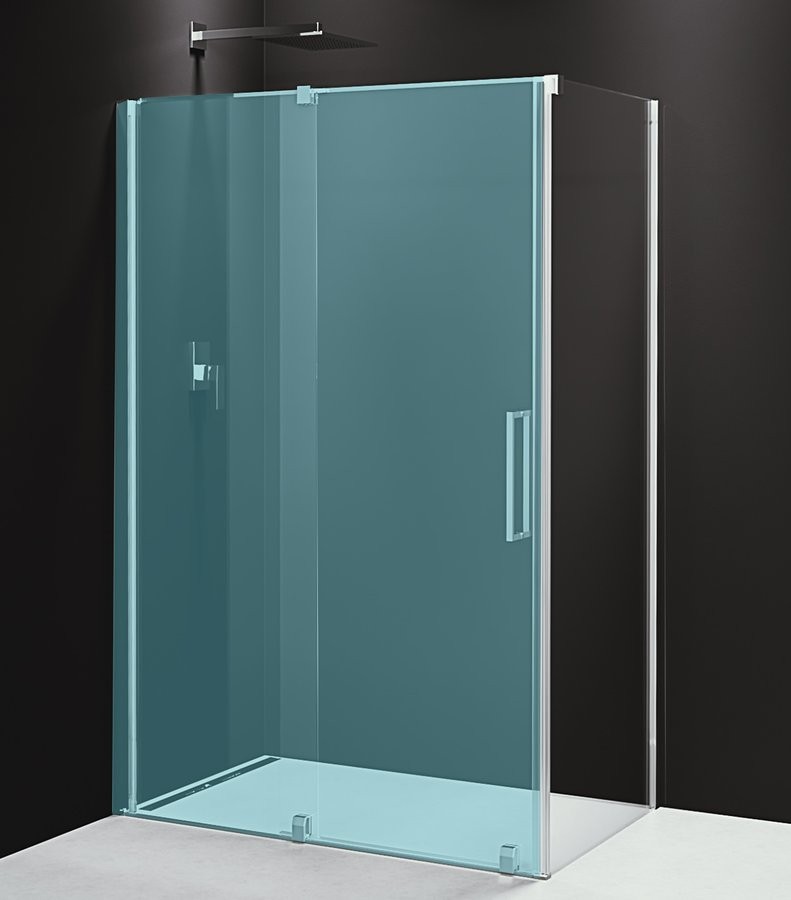 - Dvojdílné sprchové dveře do prostoru (pevná a posuvná část) s hliníkovými profily v chromu nebo matně černé povrchové úpravě