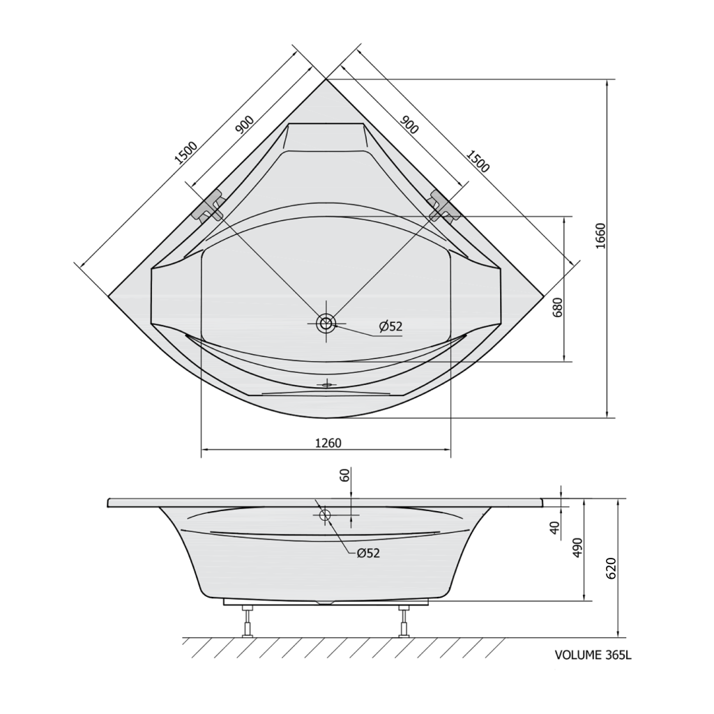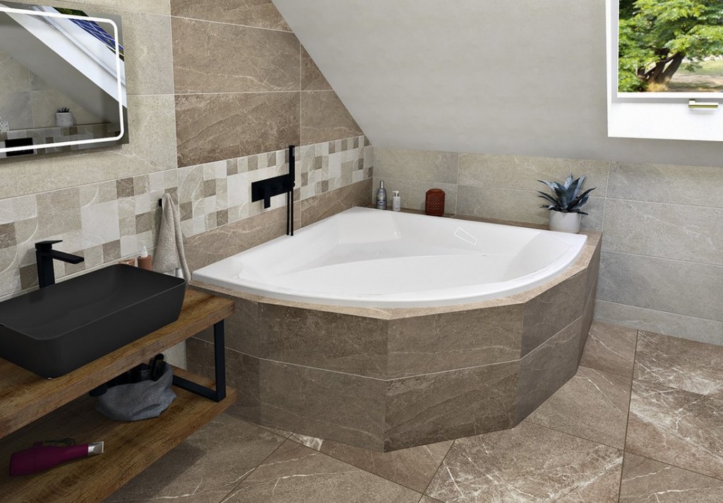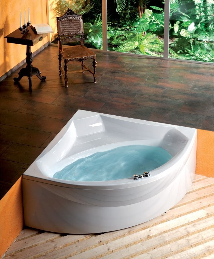 Vana s pohodlně tvarovanými stěnami pro opření zad na obou stranách a odtokem umístěným uprostřed.