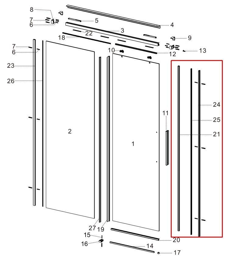Součástí je rovněž těsnění, které se umisťuje mezi profil a sklo nebo stěnu, a slouží jako ochrana proti pronikání vody. Montážní sada obsahuje veškeré potřebné drobné komponenty.