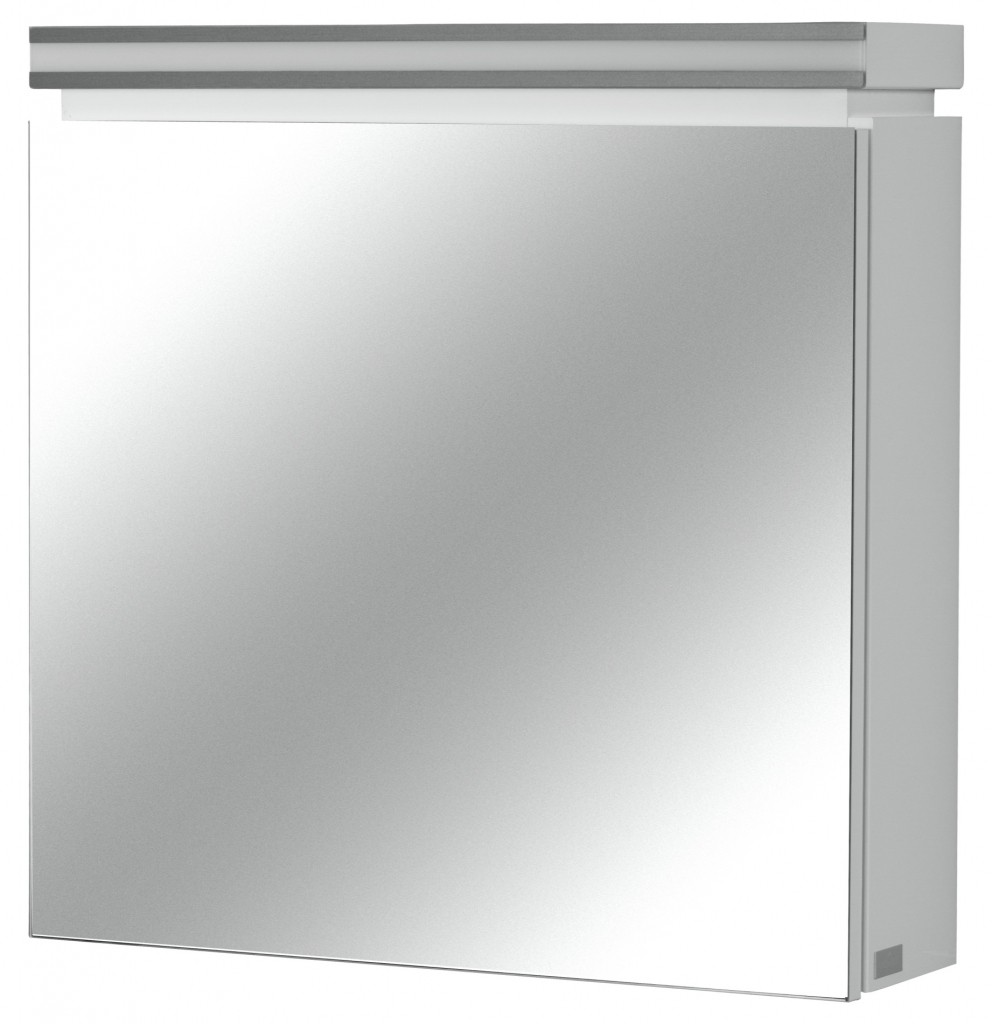 Závěsná zrcadlová skříňka OLIVIA s osvětlením v bílé barvě s lesklým povrchem a jednou policí uvnitř.