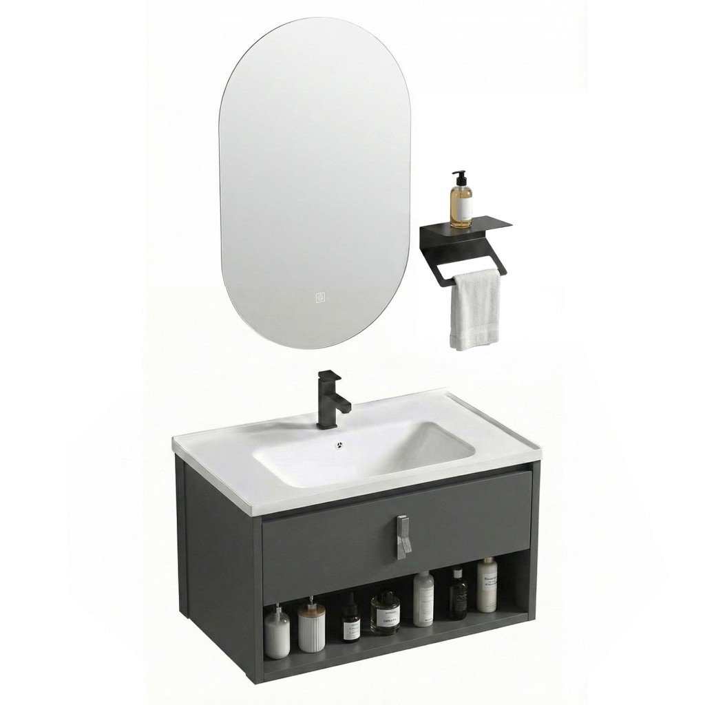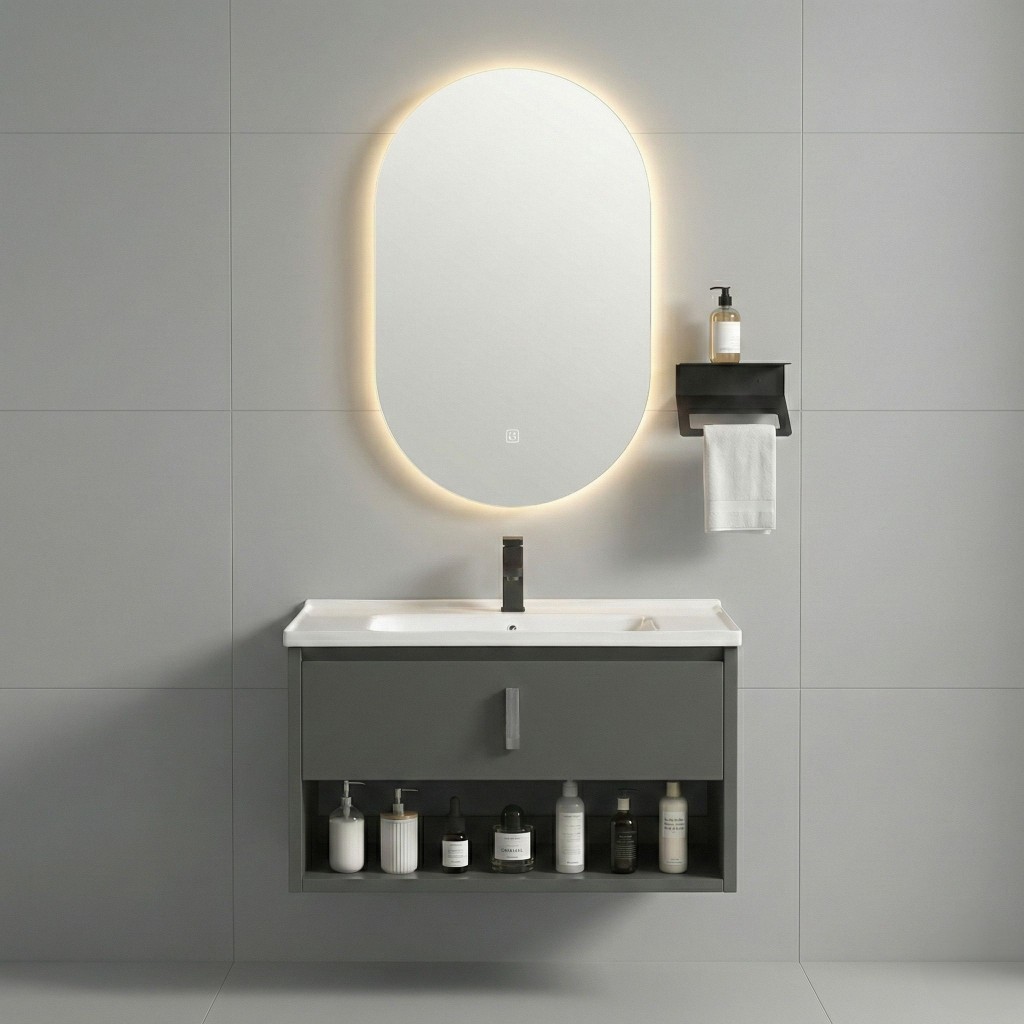 Koupelnová sestava Toledo je moderní komplet vybavení, který spojuje funkčnost umyvadlové zóny s doplňkovými organizačními prvky. Balíček se skládá ze čtyř sladěných částí: skříňky pod umyvadlo, odpovídající keramiky, podsvíceného zrcadla a nástěnného věšáku. Celek tvoří ucelené řešení připravené k montáži.Skříňka pod umyvadlo – závěsný modul nabízející různorodý úložný prostor. Konstrukce z plastu zahrnuje skříňku a otevřenou spodní polici, ideální na ručníky nebo kosmetiku.Keramické umyvadlo – model přizpůsobený rozměrům skříňky. Má široký okraj a připravený otvor pro montáž stojánkové baterie.LED zrcadlo 70×40cm – oválná plocha se zabudovaným osvětlením, ovládaným nenápadným dotykovým spínačem umístěným na skle.Věšák s poličkou – doplňkový kovový nástěnný prvek, který spojuje držák na ručník s praktickou poličkou na drobnosti.Nástěnná montáž – prvky sestavy jsou určeny k zavěšení, což usnadňuje udržování čistoty v koupelně.Komplet Toledo je rozšířené řešení pro ty, kteří ocení pohodlí. Kombinace plastové skříňky, moderního LED zrcadla a funkčního věšáku zajišťuje komfortní používání umyvadlové zóny.