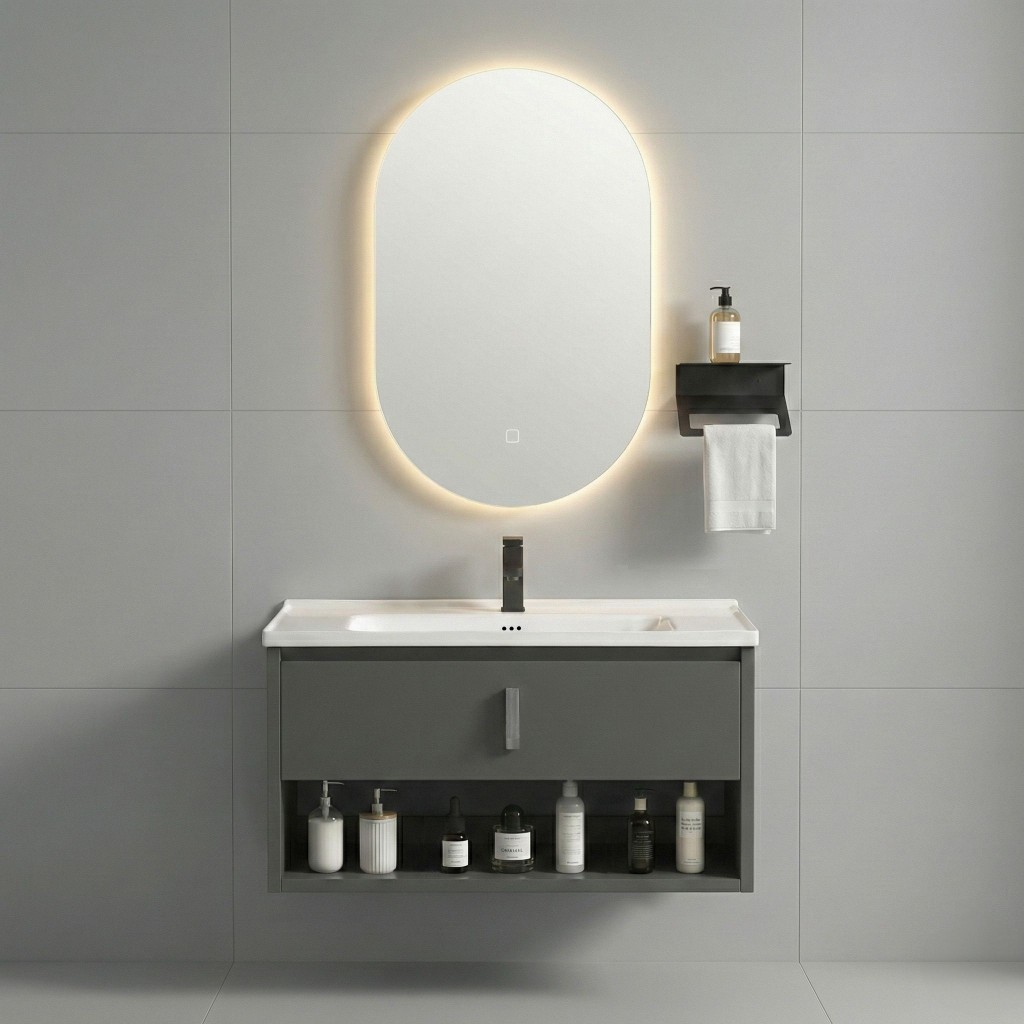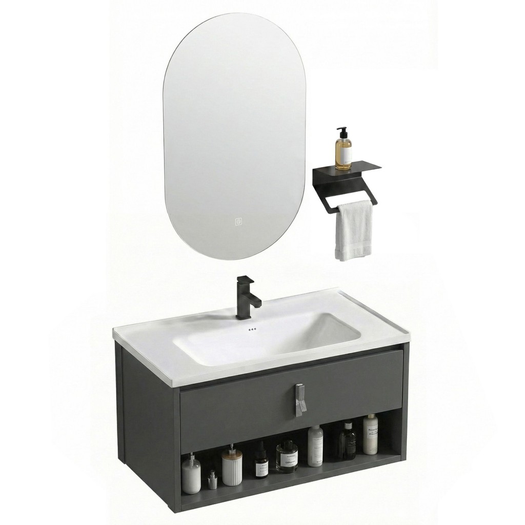 Koupelnová sestava Toledo je moderní komplet vybavení, který spojuje funkčnost umyvadlové zóny s doplňkovými organizačními prvky. Balíček se skládá ze čtyř sladěných částí: skříňky pod umyvadlo, odpovídající keramiky, podsvíceného zrcadla a nástěnného věšáku. Celek tvoří ucelené řešení připravené k montáži.Skříňka pod umyvadlo – závěsný modul nabízející různorodý úložný prostor. Konstrukce z plastu zahrnuje skříňku a otevřenou spodní polici, ideální na ručníky nebo kosmetiku.Keramické umyvadlo – model přizpůsobený rozměrům skříňky. Má široký okraj a připravený otvor pro montáž stojánkové baterie.LED zrcadlo 70×40cm – oválná plocha se zabudovaným osvětlením, ovládaným nenápadným dotykovým spínačem umístěným na skle.Věšák s poličkou – doplňkový kovový nástěnný prvek, který spojuje držák na ručník s praktickou poličkou na drobnosti.Nástěnná montáž – prvky sestavy jsou určeny k zavěšení, což usnadňuje udržování čistoty v koupelně.Komplet Toledo je rozšířené řešení pro ty, kteří ocení pohodlí. Kombinace plastové skříňky, moderního LED zrcadla a funkčního věšáku zajišťuje komfortní používání umyvadlové zóny.