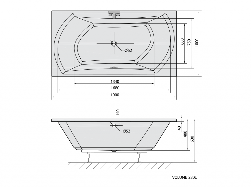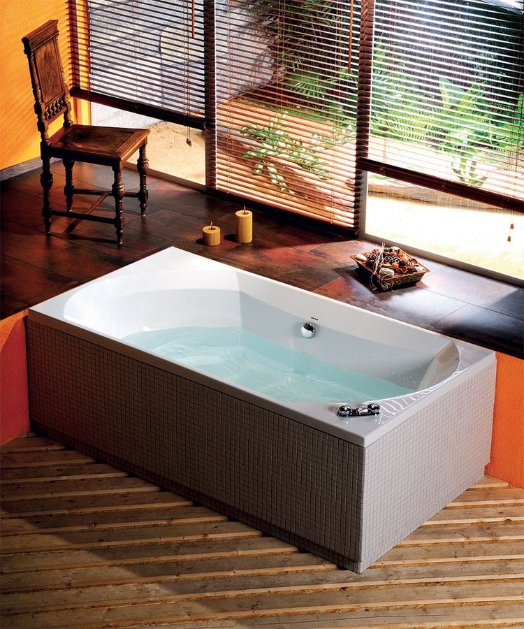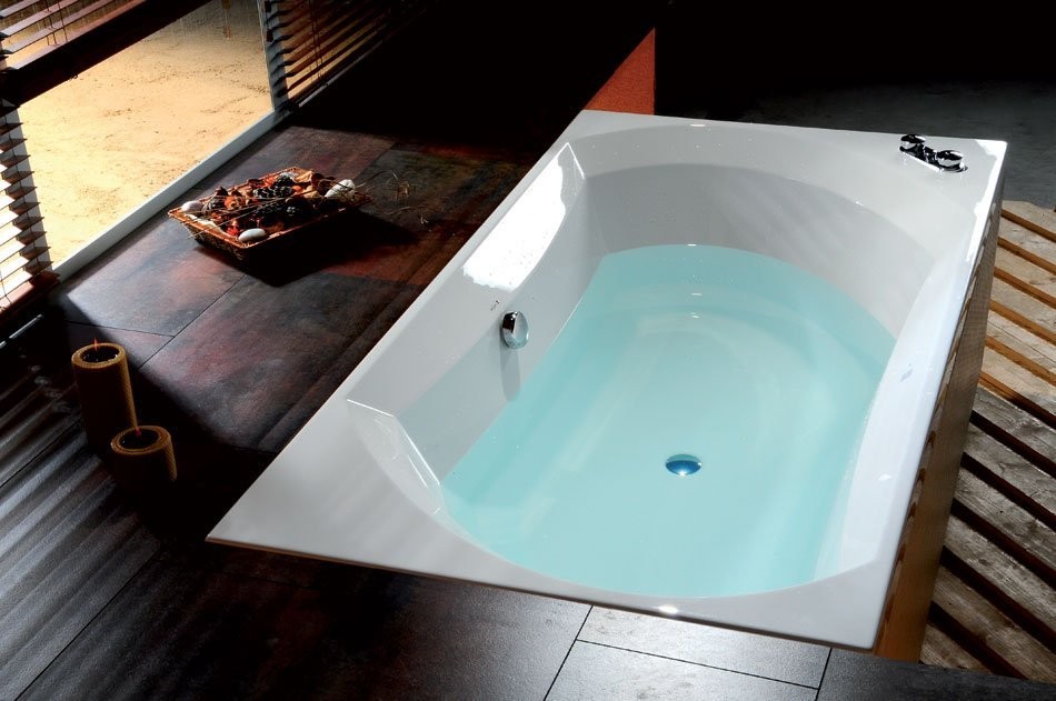 Vana s pohodlně tvarovanými stěnami pro opření zad na obou stranách a odtokem umístěným uprostřed.