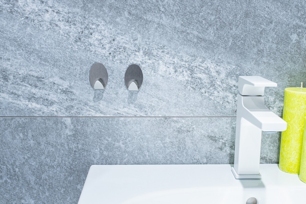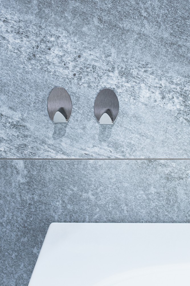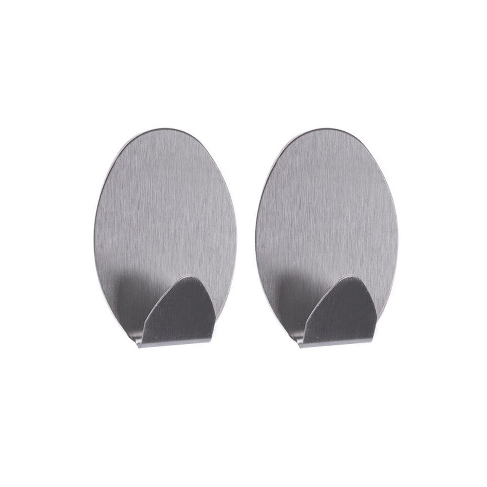 Háčky oválného tvaru z nerezové oceli, který se instalují na stěnu pomocí samolepící pásky. Součástí balení jsou 2 kusy.