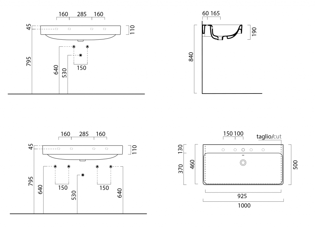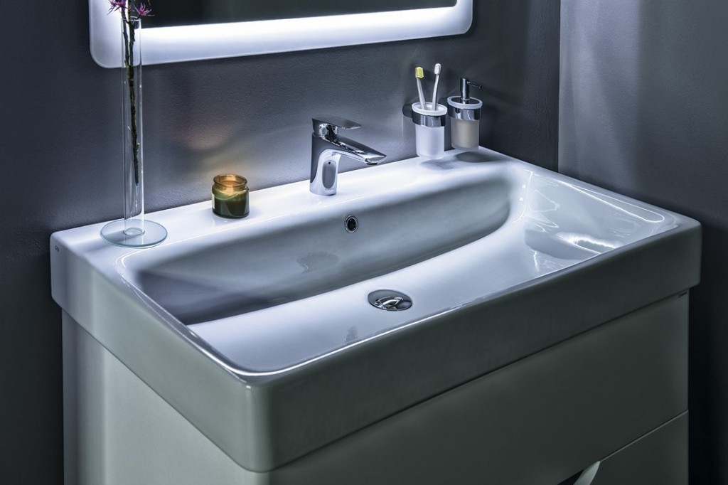 - Hranatá umyvadla s decentně zaoblenými rohy a štíhlou přední hranou