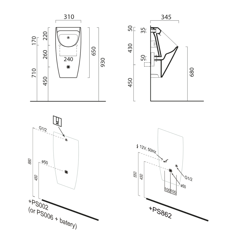 - Při instalaci s automatickým splachovačem PS002 je nutné instalovat i napájecí zdroj (PS05T nebo PS10T).