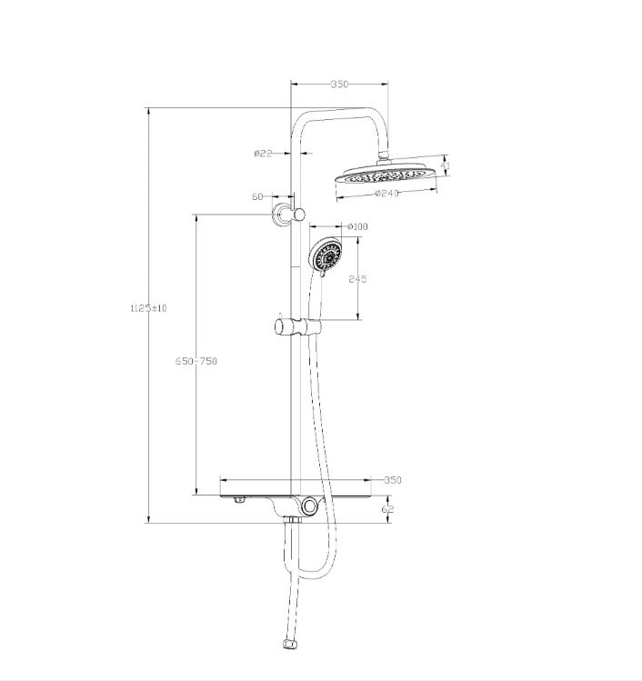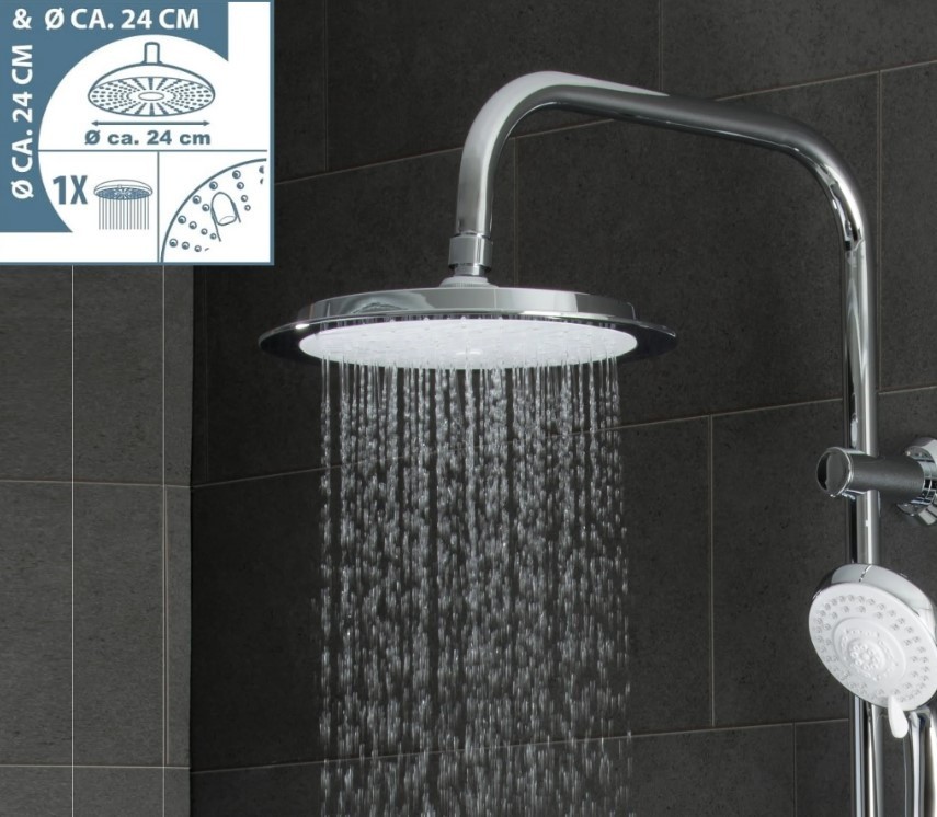 Vysoce kvalitní sprchový sloup z nerezové oceli výškou cca 112 cm. Velkoformátový sprchový talíř s dešťovou sprchou o průměru cca 24 cm.