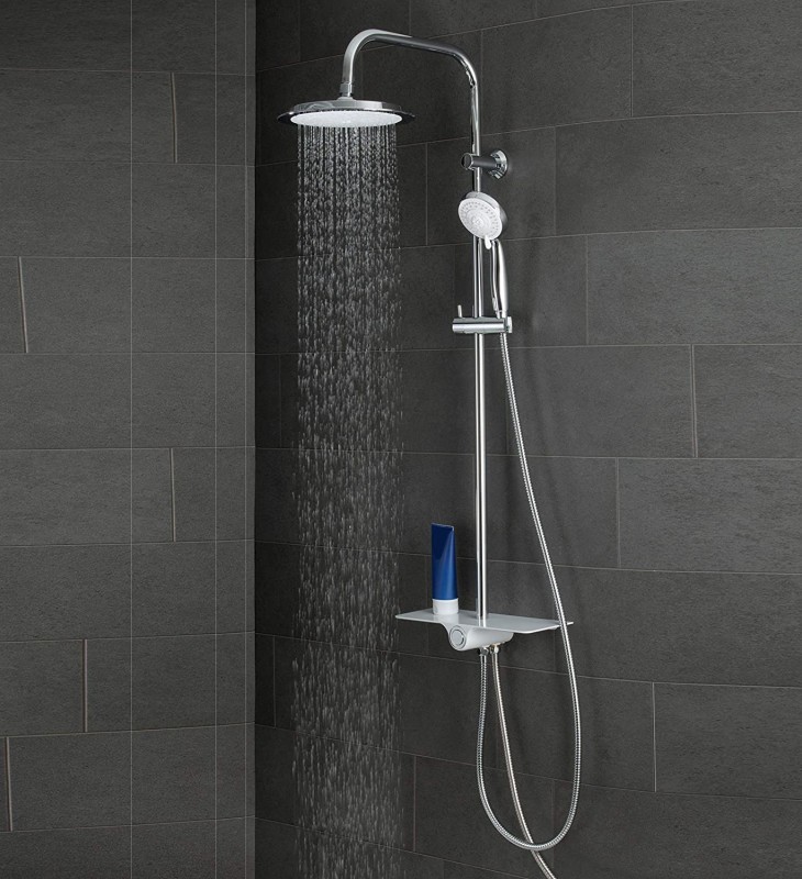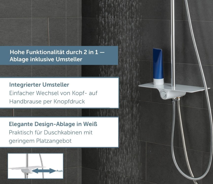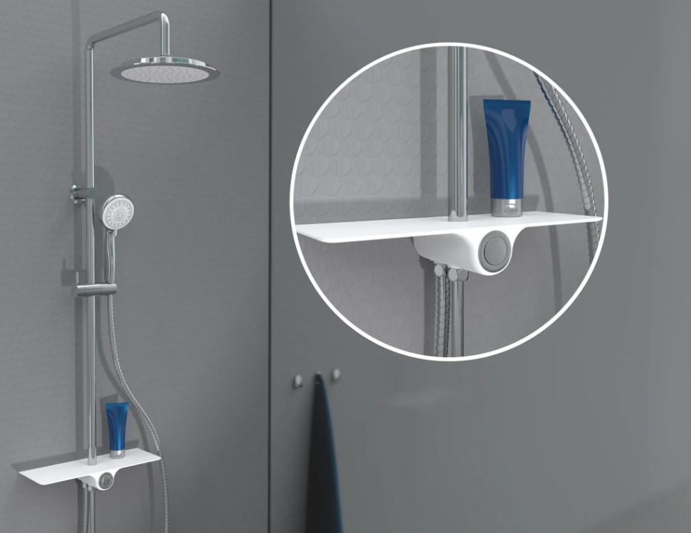 Stylově integrovaný přepínač tlačítek v polici pro snadné přepínání mezi horní a ruční sprchou. Velmi příjemným doplňkem je polička v bílé barvě, kterou můžete použít pro odkládání např. sprchového gelu, šamponu apod.
