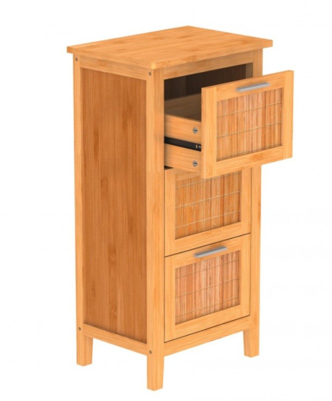 Bambusový nábytek od firmy Schütte se vyznačuje vysokou kvalitou a nadčasovým designem. Bambusová skříňka disponuje třemi šuplíky. Nabízí tedy dostatek úložného prostoru např. pro ručníky, osušky nebo pro kosmetiku.