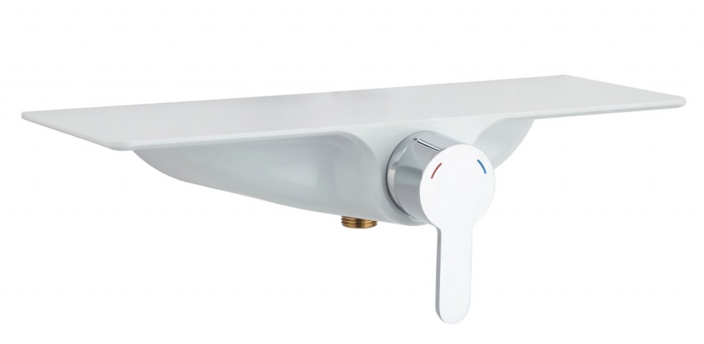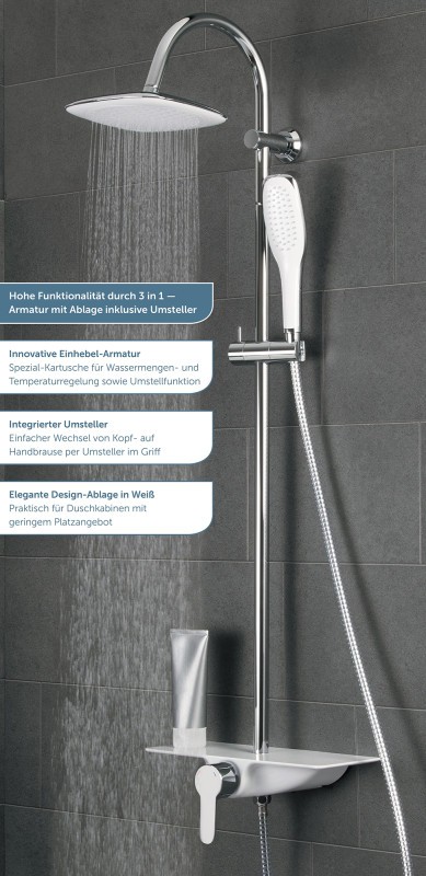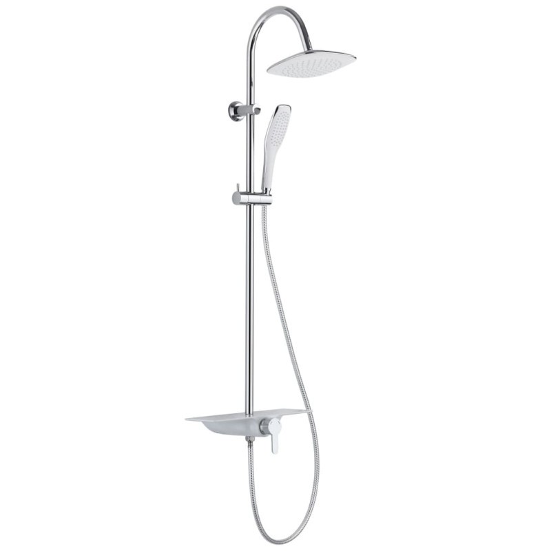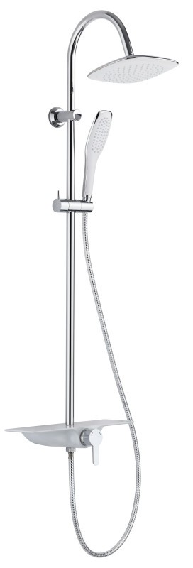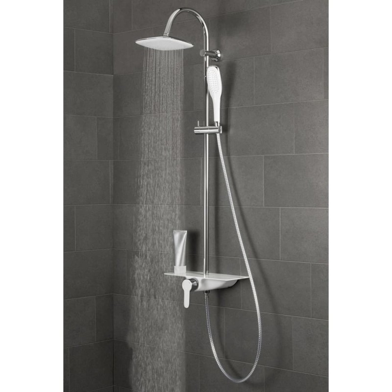 Součásti sprchového setu je luxusní polička v elegantní bílé barvě. Která může sloužit například na odložení sprchového gelu nebo šamponu. Uprostřed je tlačítko, kterým jednoduše přepínáte proud vody mezi hlavovou a ruční sprchou.