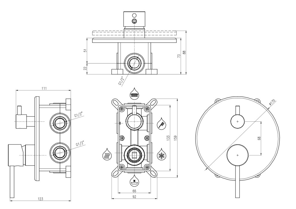 Tuto baterii můžete použít buď do sprchového koutu jako kombinaci tří prvků a nebo k vaně jako kombinaci např. napouštění přepadem, ruční sprcha a hlavová sprcha nebo výtokové ramínko, ruční sprcha a hlavová sprcha.