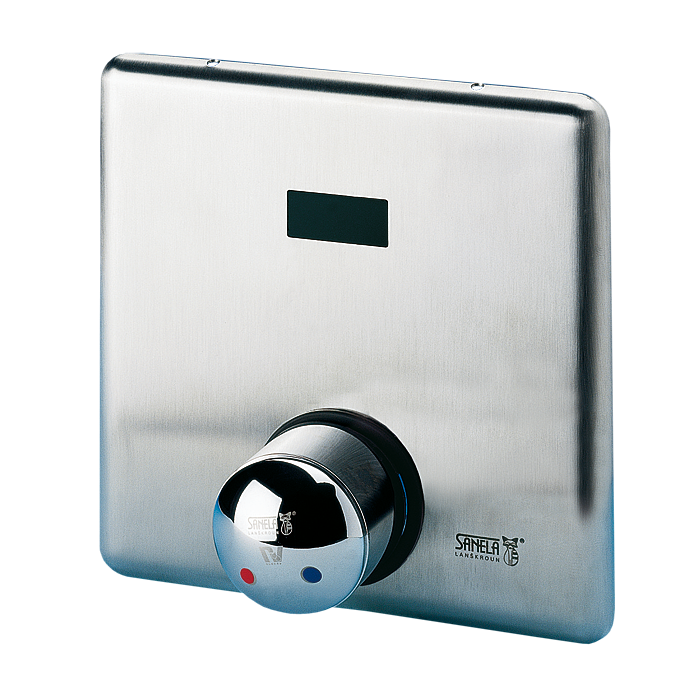 SLS 02 - obj. č. 02020 - nerezový kryt s elektronikou, nerezová instalační krabice se zabudovaným elektromagnetickým ventilem, míchací baterií a šroubením