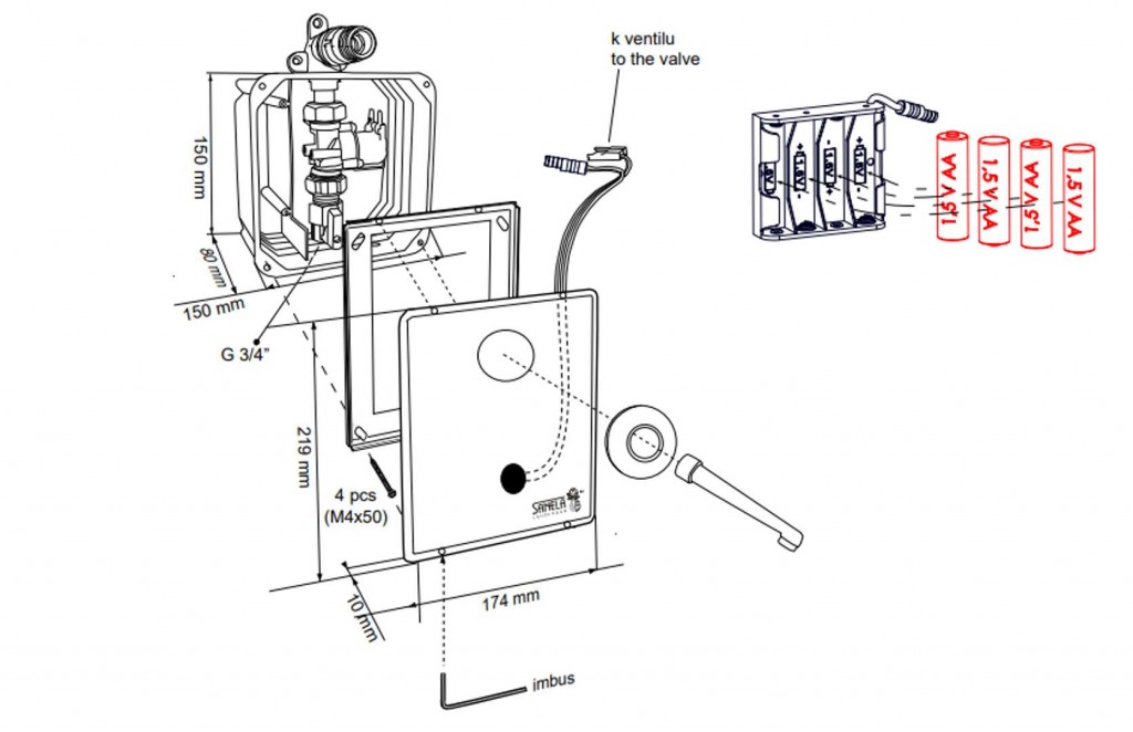 nerezový kryt s elektronikou a piezo čidlem, nerezová instalační krabice se zabudovaným elektromagnetickým ventilem a šroubením, výtokové ramínko 170 mm, lithiová napájecí baterie SLA 09
