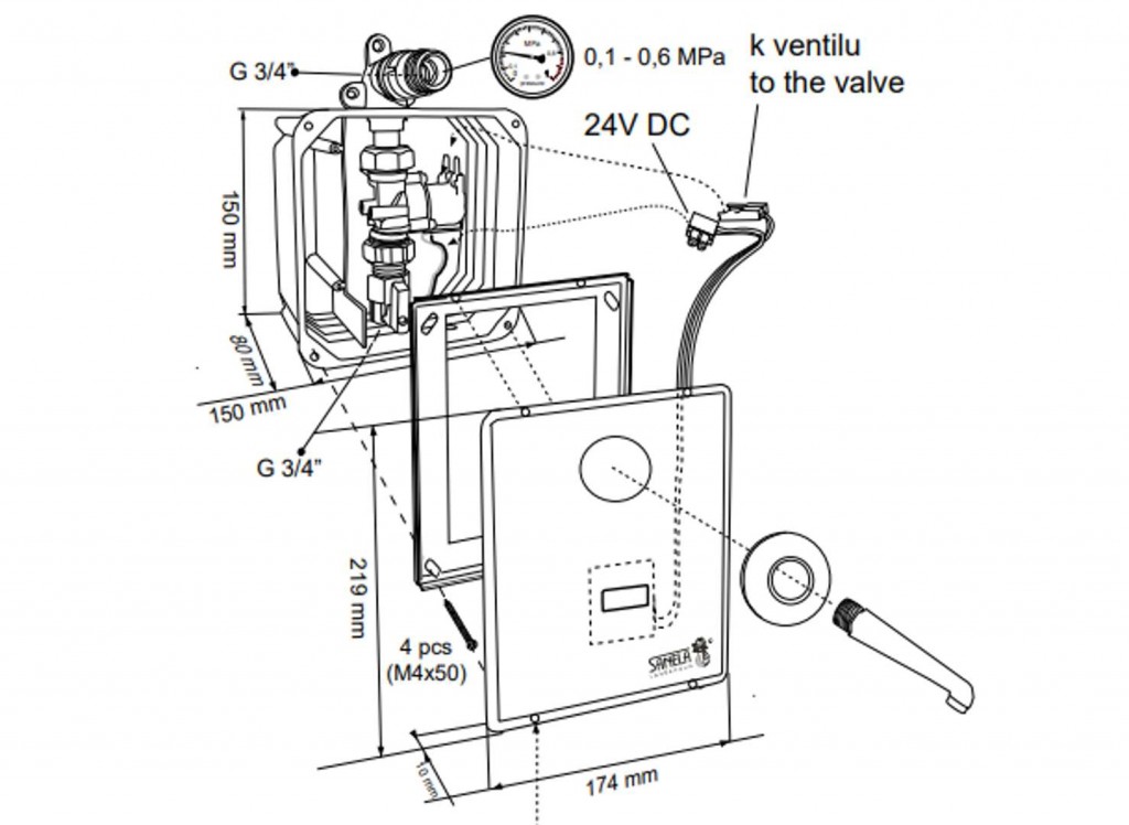 nerezový kryt s elektronikou, nerezová instalační krabice se zabudovaným elektromagnetickým ventilem a šroubením, výtokové ramínko 170 mm