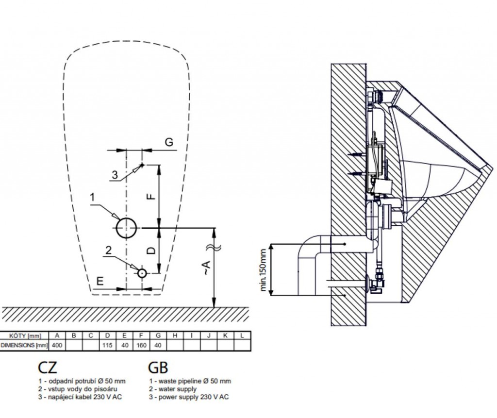 keramický pisoár, montážní lišta s radarovým splachovačem, elektromagnetický ventil, propojovací hadice, rohový ventil, speciální vtoková armatura s těsněním, sifon, upevňovací sada, montážní šablona