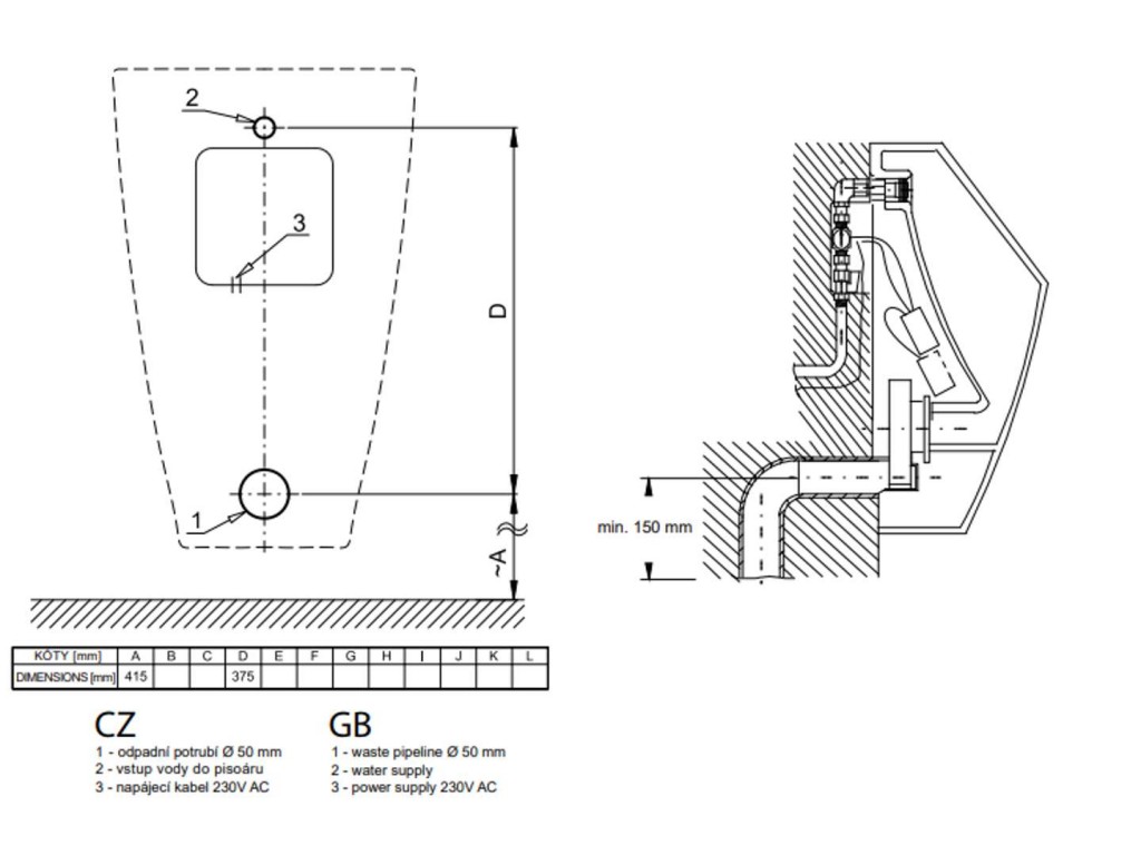 keramický pisoár s integrovanou radarovou elektronikou, montážní plastová krabice se šroubením, elektromagnetickým ventilem a kulovým ventilem, výtoková armatura s těsněním, sifon, upevňovací sada, plastový poklop, integrovaný napájecí zdroj