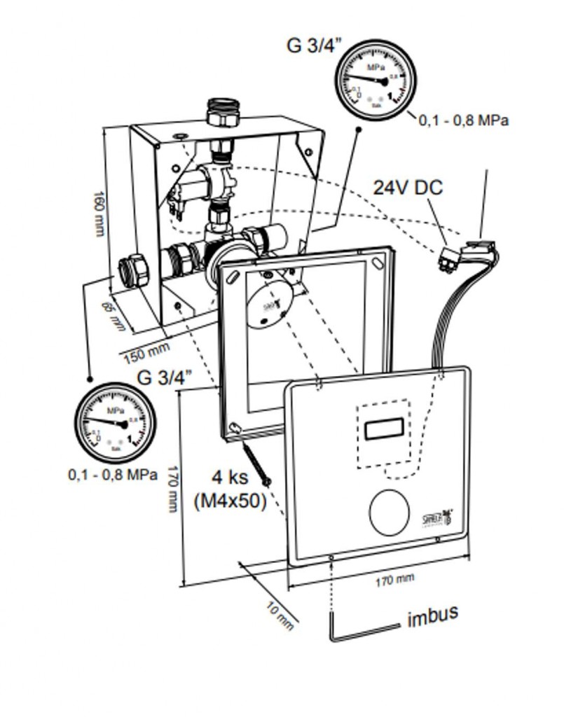 - nerezový kryt s elektronikou pro bateriové napájení, nerezová instalační krabice se zabudovaným elektromagnetickým ventilem, míchací baterií a šroubením, včetně napájecí baterie