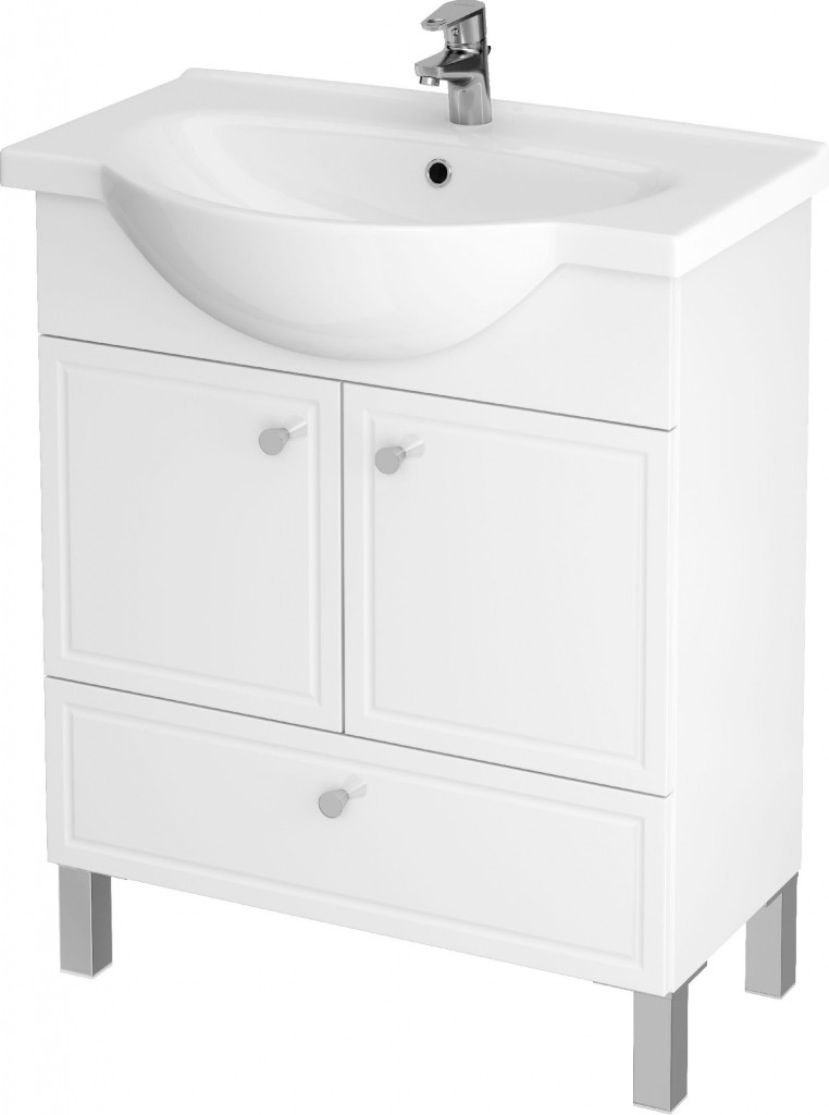 Stojící umavadlová skříňka v bílém provedení s dvěmi dvířky a jedním šupletem včetně umyvadla.