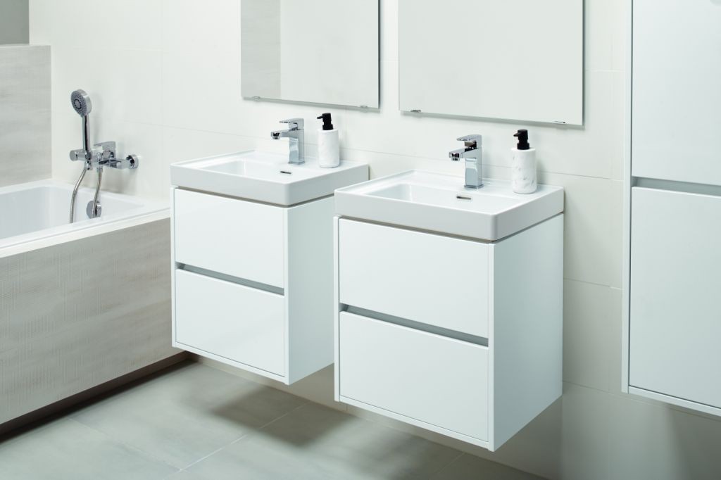 Závěsná umyvadlová skříňka CREA 50 se dvěma výsuvnými boxy v bílém provedení, vyrobená moderní technologií AQUASAFE /zvýšená odolnost proti vlhkosti/. Skříňka působí elegantním vzhledem díky zapuštění přední části a využití skrytých madel. Zásuvky jsou vybavené pojezdy "HAFELE" s plným výsuvem a tichým uzavíracím systémem, který zvyšuje komfort používání.