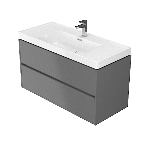 Závěsná umyvadlová skříňka CREA 100 se dvěma výsuvnými boxy v šedém provedení, vyrobená moderní technologií AQUASAFE /zvýšená odolnost proti vlhkosti/. Skříňka působí elegantním vzhledem díky zapuštění přední části a využití skrytých madel. Zásuvky jsou vybavené pojezdy "HAFELE" s plným výsuvem a tichým uzavíracím systémem, který zvyšuje komfort používání.