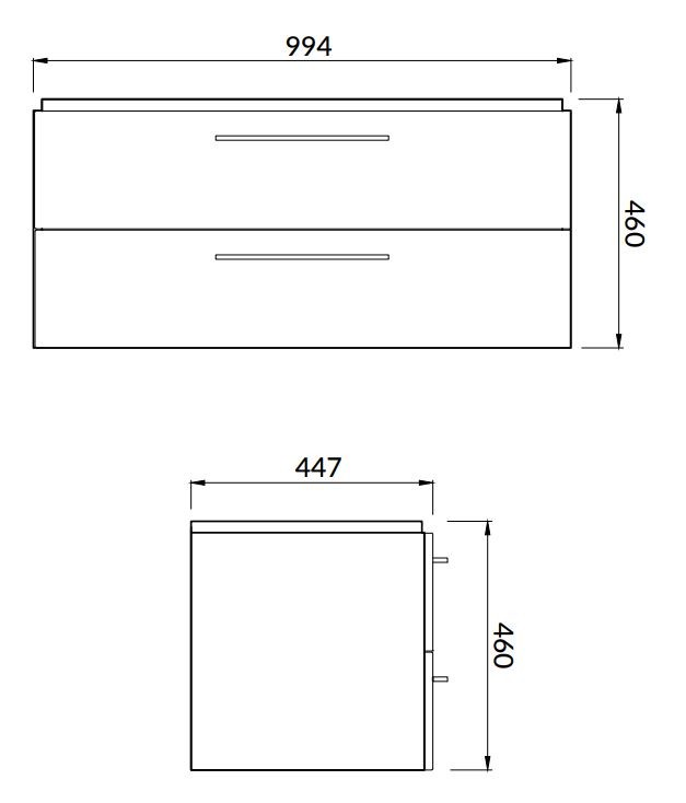 Závěsná skříňka LARA v lesklém bílém provedení s dvěma šuplíky se systémem měkkého dovírání, je doplněna chromovými madly, dodávaná včetně keramického umyvadla MILLE s otvorem pro baterii a přepadem.