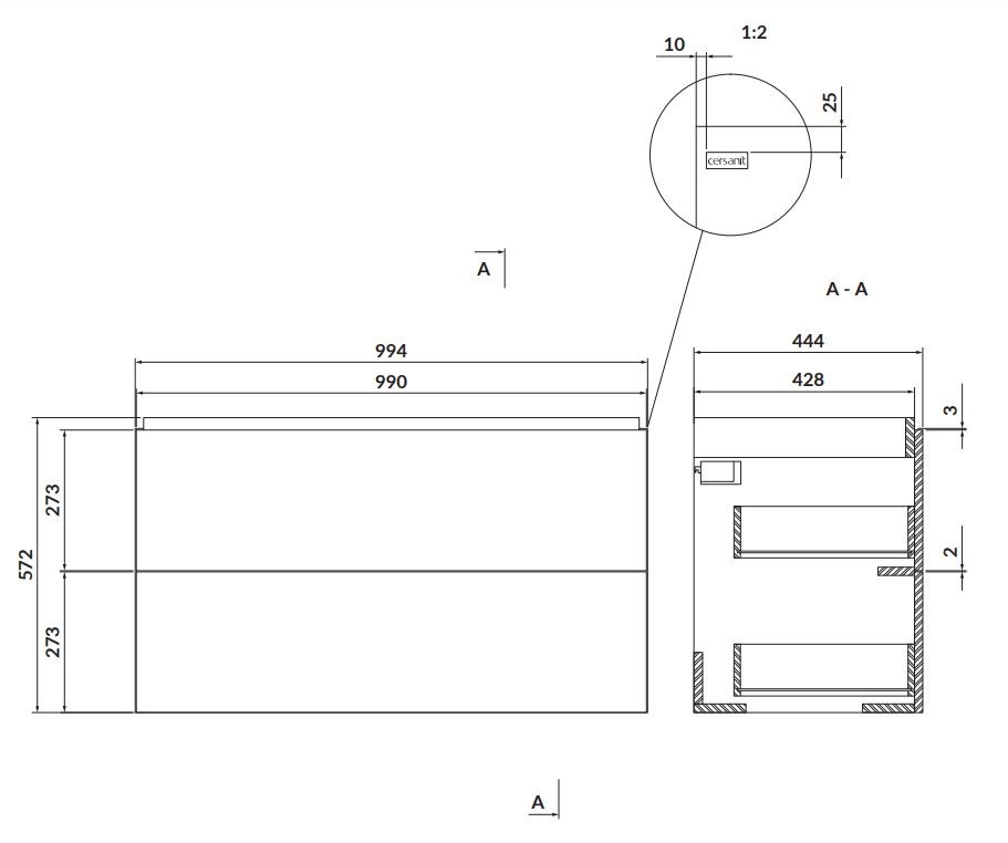 Umyvadlová skříňka LARGA s šedým vnitřkem dvou prostorných zásuvek s měkkým zavíráním soft-close. Dřevotřísková deska, ze které je skříň vyrobena, má certifikát FSC MIX 70% SGSCH-COC-007574. Nábytková frézovaná madla lze vybrat ve třech barvách (stříbrné, zlaté, černé), k zakoupení samostaně, není součástí skříňky.
